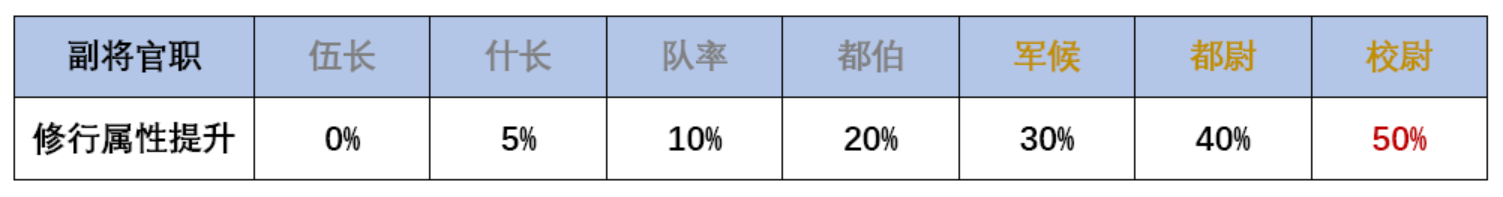除副将修行等级及修行进度影响,副将官职也会在累计修行属性上再乘以一个最终提升系数。