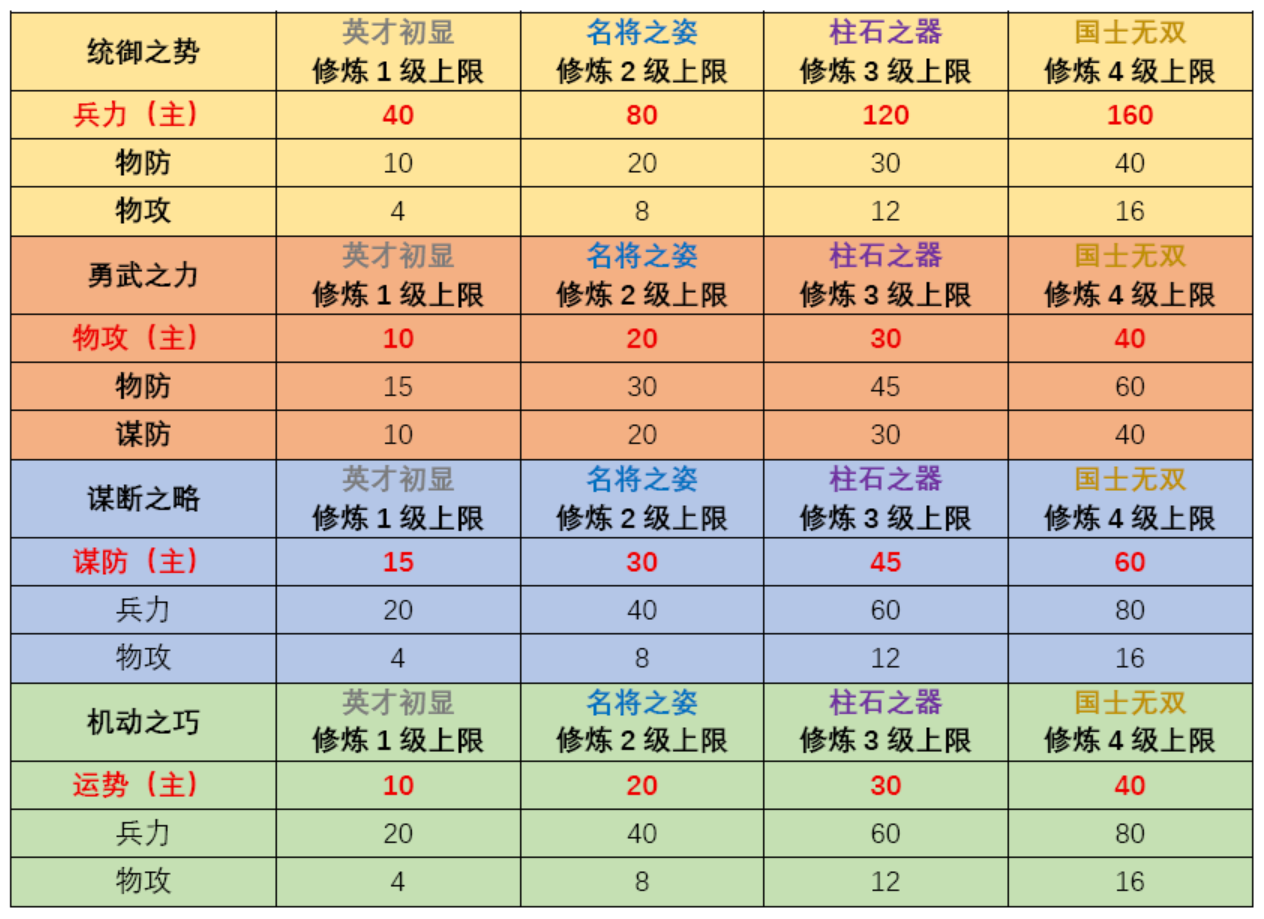 以物理系副将为例,4个修行等级对应数值上限见下表。