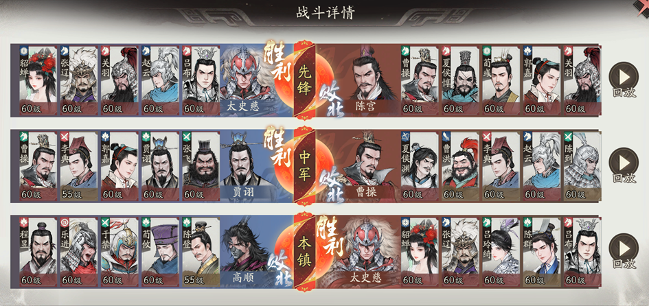 进入玩法后,玩家应先对自己的防守队伍进行布阵。对局分为先锋(第一场)、中军(第二场)、本镇(第三场),每场对局地图不同。
