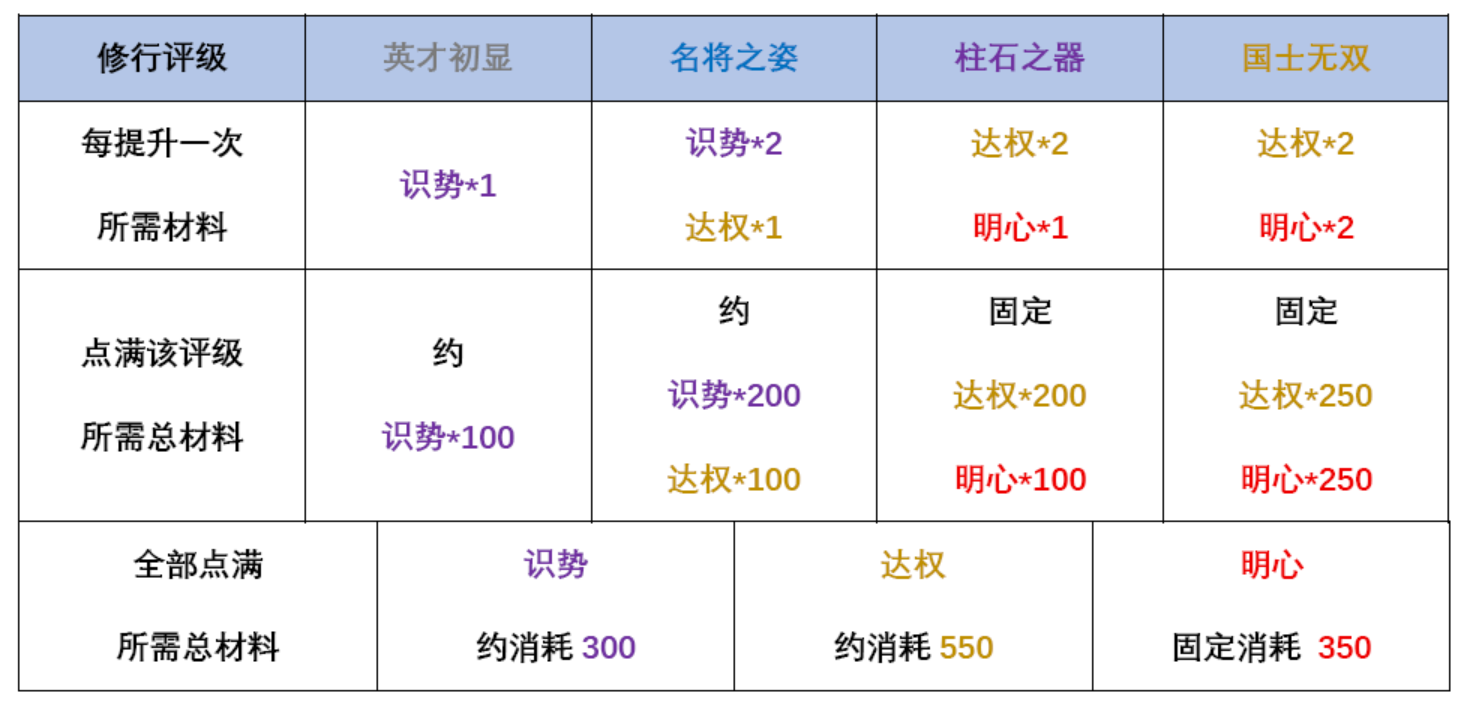 不同评级修行所需材料与点满单个副将总计所需材料见上表,由此可知副将修行不管如何分配修行方向优先级,最终点满所消耗的总材料基本一致(识势与达权会有个位数出入,明心永久固定)。玩家在修行过程中只需考虑优先以提升最大的攻击属性为主,在相同养成时间内达到练度提升最大化即可。
