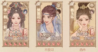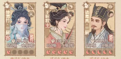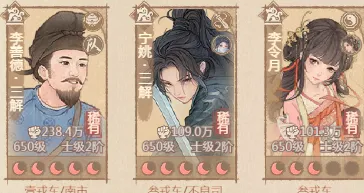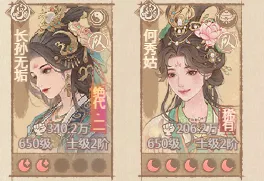 三、名士僚属①樊梨花:玄龟x4②梁红玉:玄龟x4③李一桐:神鹿x4/上鹿x2+下龟x2/虎啸x4/上鹿x2+下虎啸x2(双C带前两套,主C带后两套)④文成公主:神鹿x4/上鹿x2+下龟x2⑥杨玉环:神鹿x4/上鹿x2+下龟x2⑦鱼玄机:神鹿x4/上鹿x2+下龟x2⑧唐玄奘:神鹿x4⑨聂隐娘:虎啸x4⑩陈平安:玄龟x4