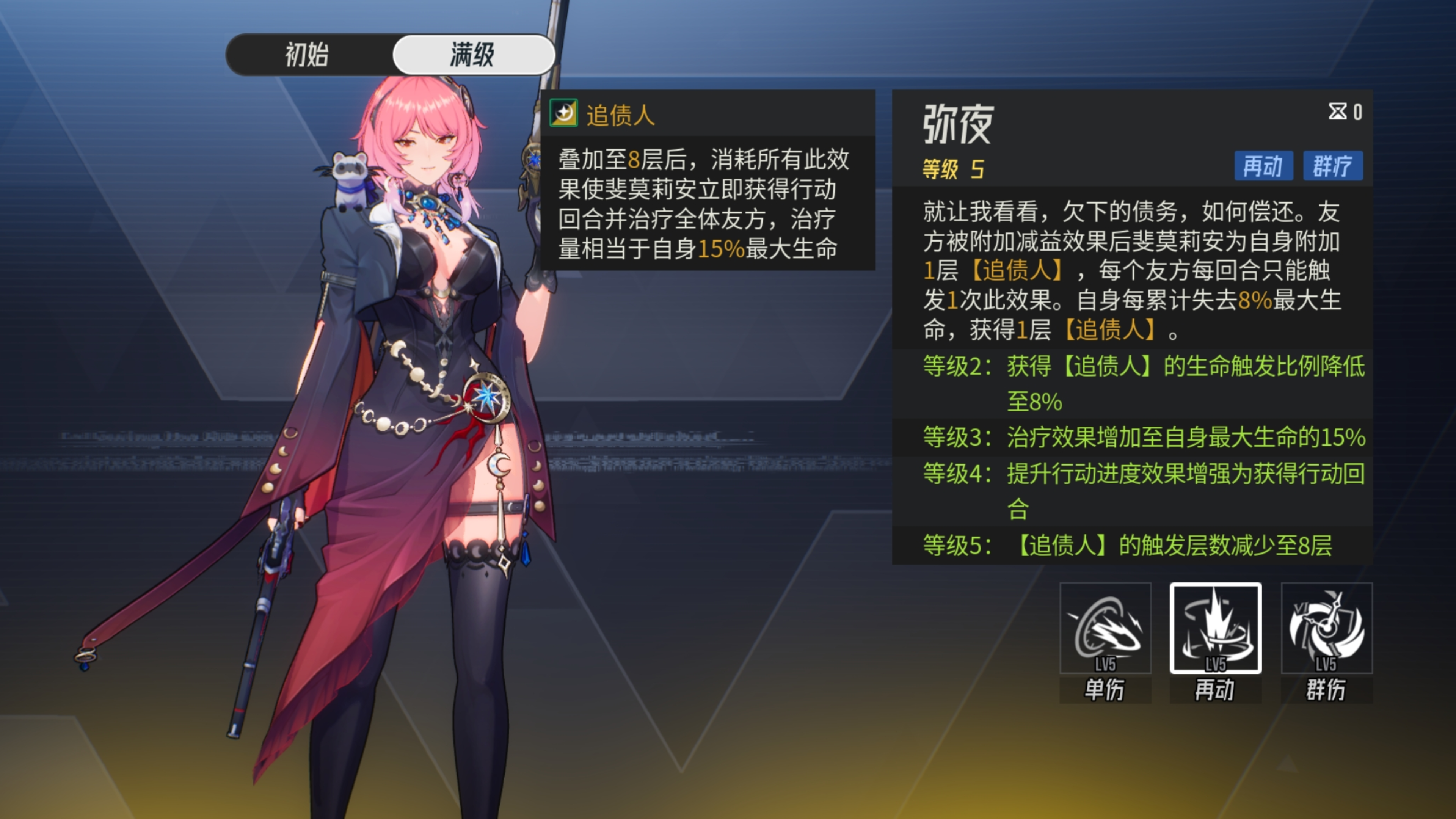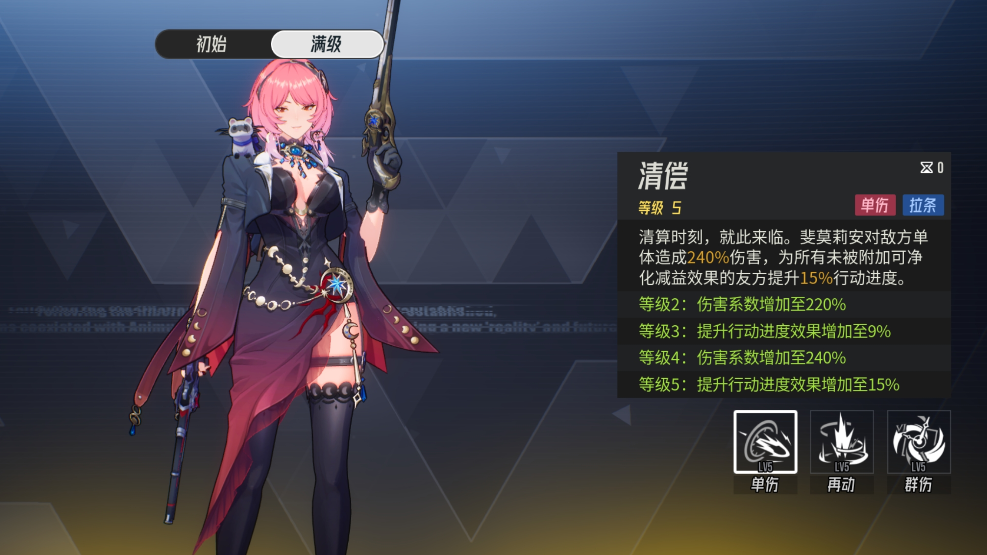 配合被动,普攻点满的收益是比较高的,也推荐普攻点满5级;但如果当前分段速控比较多,可以在普攻升级之前先把终结技升满,驱散全部减益效果