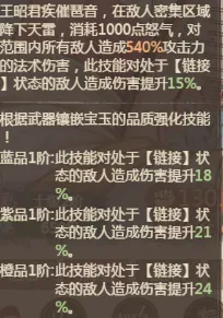 王昭君:1、普攻无特殊附加效果,仅为友军提升暴击率,无法形成有效输出压制。2、必杀技消耗1000怒气,对范围内敌人造成常规法术伤害,仅对“链接”状态目标有伤害加成,伤害倍率低于白蛇,主要用于清理杂兵或压低敌方整体血线。