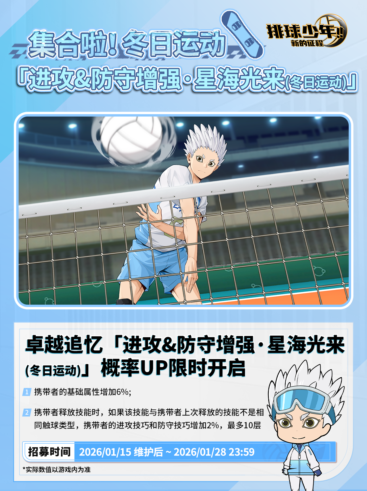 🏐卓越追忆招募限时开启:「进攻&防守增强・星海光来(冬日运动)」。