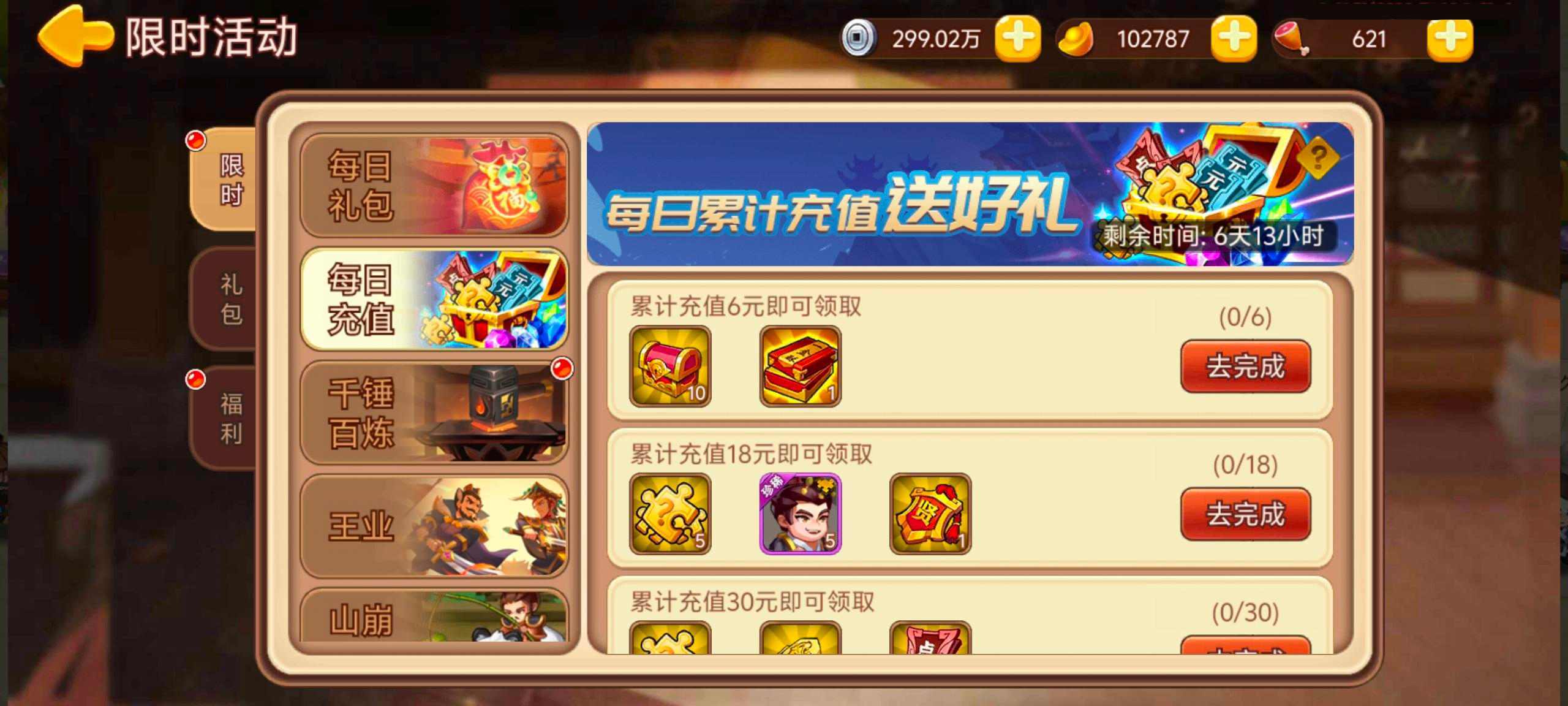 活动内容:活动期间每天累积充值至指定额度,即可领取奖励。次日0点刷新充值进度。