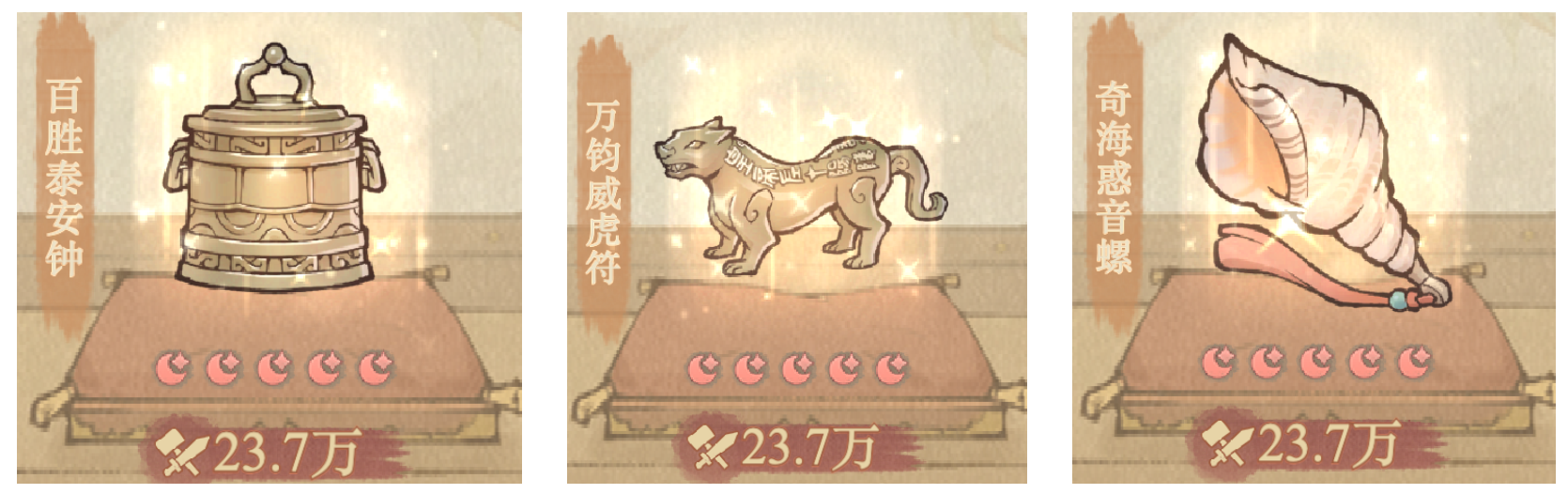 宗府流无垢的搭配思路如果玩家走的是“宗府无垢”路线,比如搭配武则天,那么思路就要变一变。这个阵容对于“威仪”属性的需求没有官府流那么高,所以在助战宝具上,“神行戎威鼓”(神行鼓) 反而比火龙更合适,它能直接提升队伍的基础属性。当然,如果没有神行鼓,用火龙凑合一下也是可以的。主战宝具方面,由于宗府流往往需要通过叠加状态来保命,日晷和香囊的优先级会更高一些,能让队伍站得更久。增幅宝具依然首选 獬豸。平民过渡与通用建议对于还没有抽到上述稀有宝具的普通玩家,或者处于赛季初期的过渡阶段,不需要搞得太复杂。主战宝具直接用 “百胜泰安钟”,它加攻击和暴击,万金油且实用。助战宝具选择 “万钧威虎符”,能降低对手主力的攻击力,减少战损。增幅宝具则用 “奇海惑音螺”。这一套虽然是普通橙色宝具,但升星容易,成型快,性价比很高。