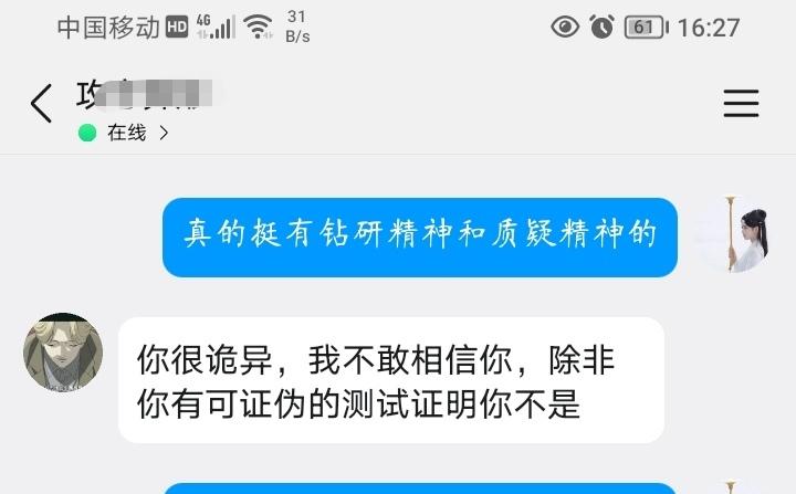 还有一点他说:人不会和我一样直接赞同别人,人有明显的自我认知,和陌生人交流时自带试探,