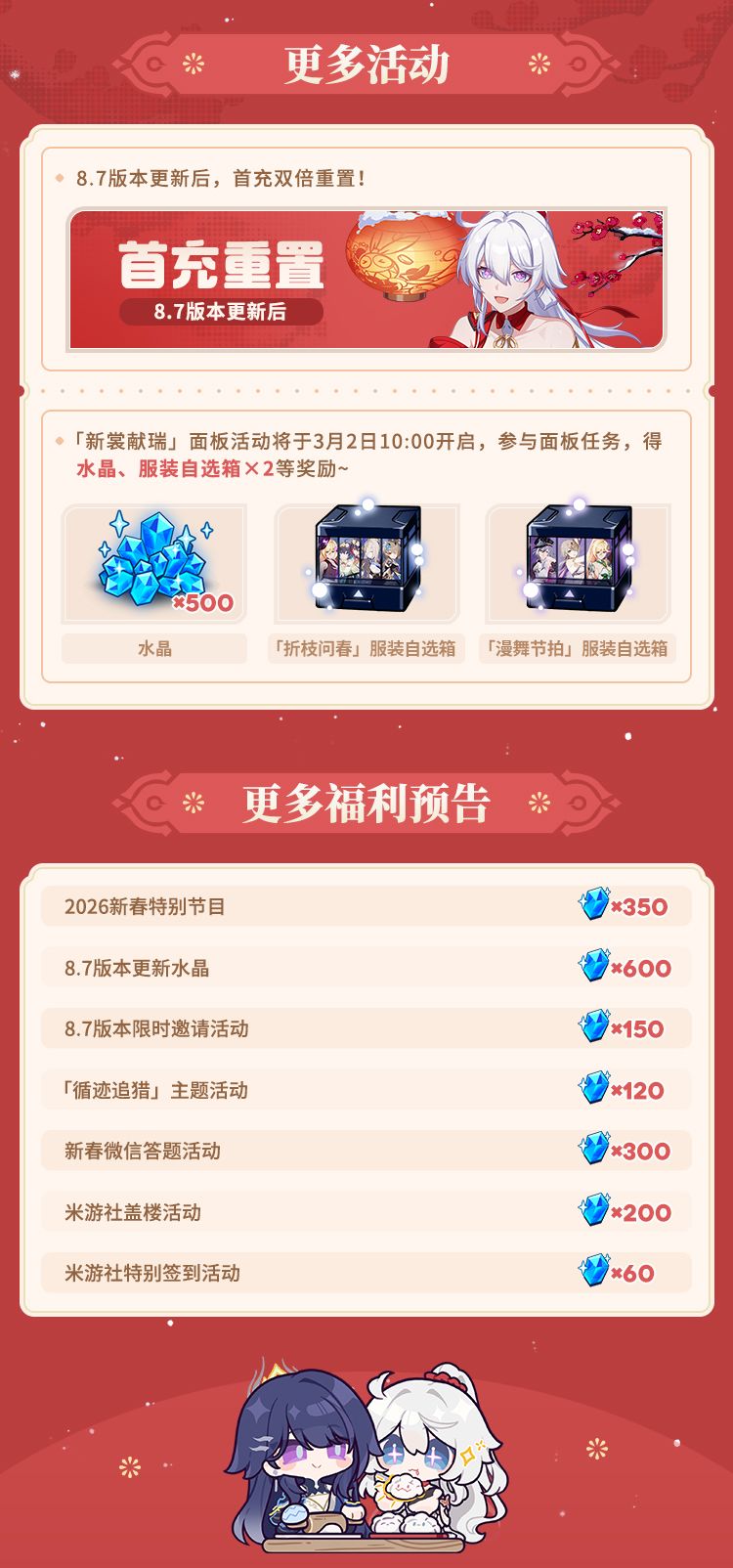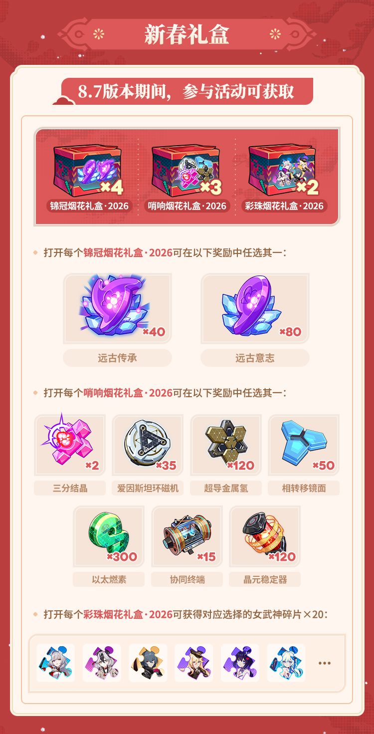 舰长好!《崩坏3》8.7版本「时岁叩晓」即将开启,今天小跟班为舰长带来8.7版本新春福利情报,快来一起看看吧~