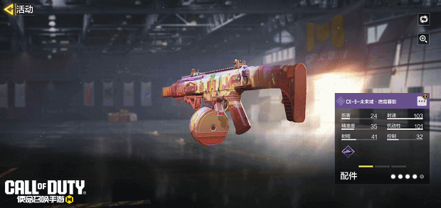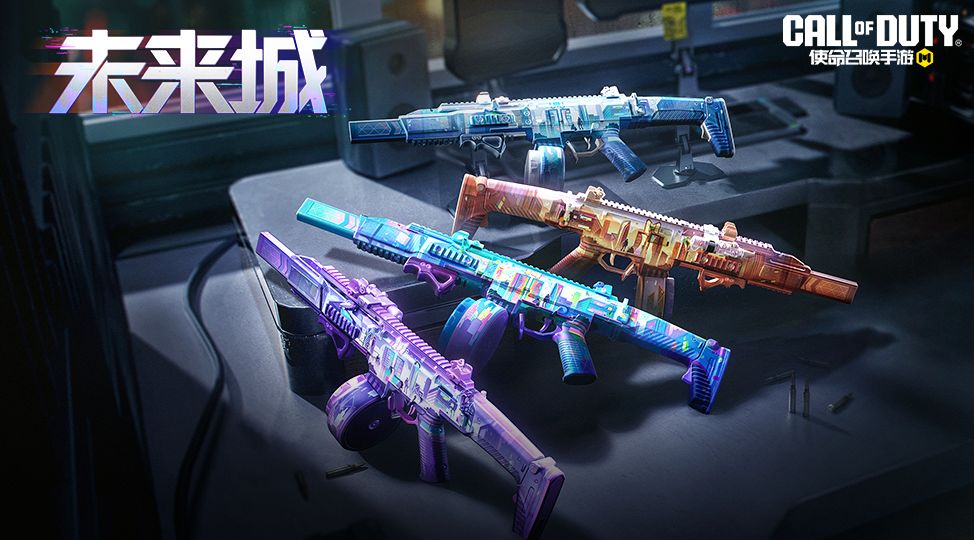 CX-9-未来城 · 霓火朝晖这把武器以蓝色和紫色为主调,搭配着明亮的霓虹色彩,在晨曦中闪耀。