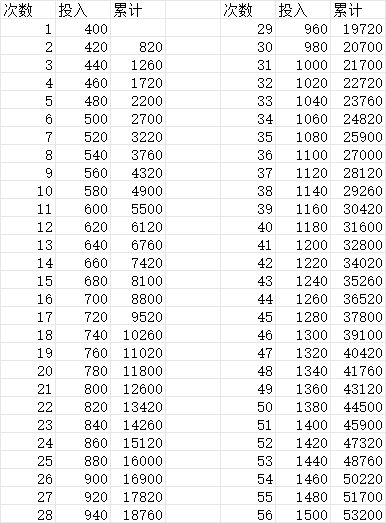 也就是从也就是从第16次投到56次,才41次。后面的三次都是1500。用累计金额53200,减去第15次的累计金额8100。得45200,再加三次1500。也就是46700。