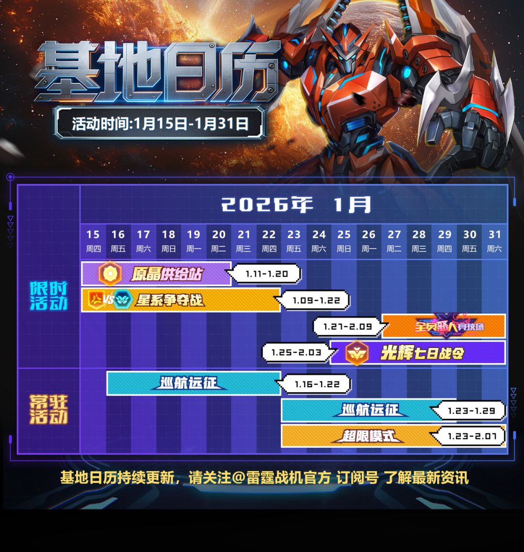您的一月下旬星际日程表已更新,请查收✨从限时挑战到资源补给,记得标记日程哦!更多惊喜内容正在紧锣密鼓地筹备中,敬请期待后续的星空冒险~