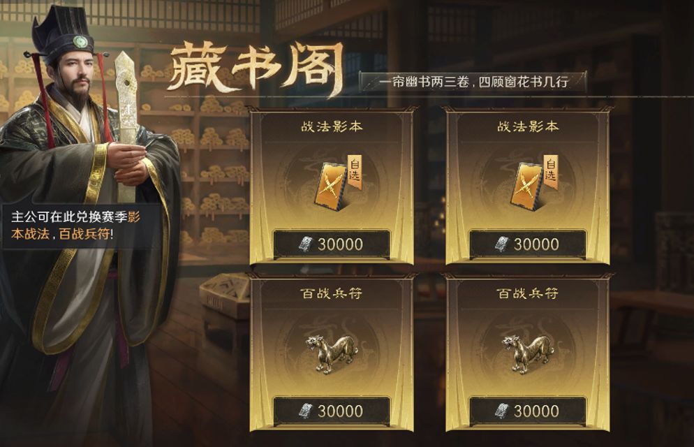 主公可用武勋兑换「战法影本」和「百战兵符」道具,以下是解锁节奏: