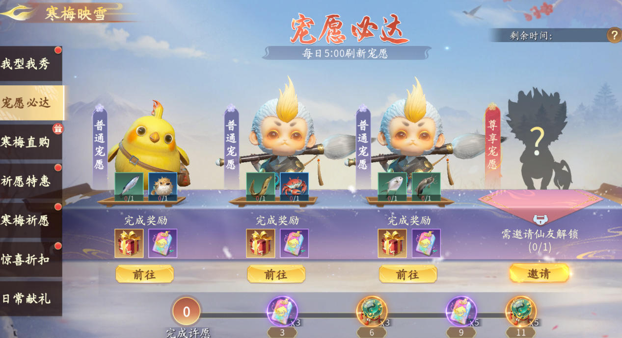 灵宠有心愿,主人来帮忙!灵宠们每日会派发4个愿望,其中尊享宠愿需要邀请仙友解锁,解锁后可刷新珍品甚至极品奖励!在特定地点钓鱼采药,或直接前往灵宠处购买提交即可完成愿望获得灵宠的回礼,累计完成一定数量的愿望还可获得如意符!