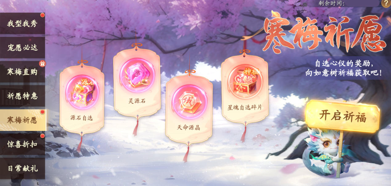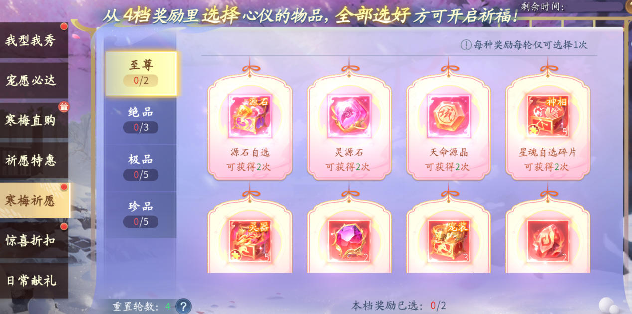 祈愿树限时开启!4档奖励随心选,如意祈福好礼来!消耗如意符进行祈福可得心选好礼,超多养成材料等你来享!获得当前所有奖励后可重置如意树,重新选择奖励开启新一轮祈福。活动首日可重置2轮,次日起每日额外增加1个重置轮数。