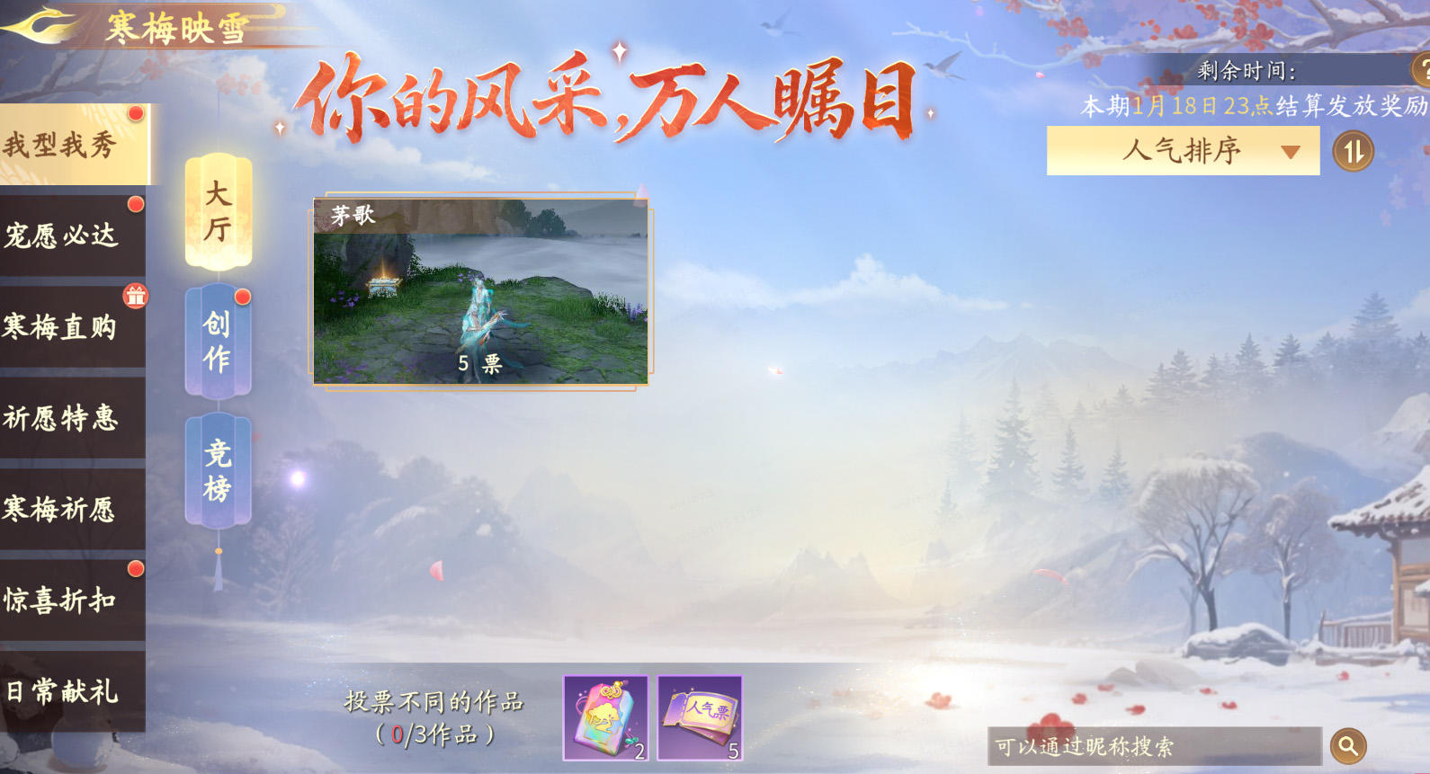 你的风采,万人瞩目!仙友们通过拍照、创作、参赛,然后竞榜争夺冠军,每期大赛持续1天,将在第一天5点开始,当天23点结算,然后下一天5点开启下一期;每期可以选择1个作品参赛,无法更改。