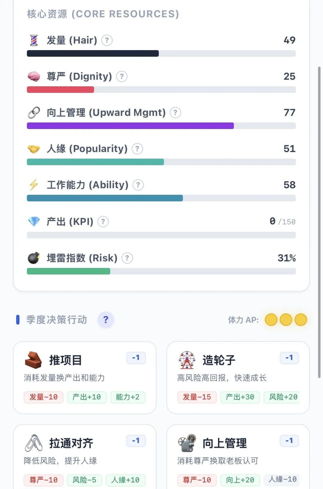 限定玩法,没有资产,基于Vibe Coding,文字型RPG只能比拼开发者最纯粹的内容创意。《大厂模拟器》就是一个例子。游戏的画面相当于没有,但这个话题对于互联网从业者来说,代入起来实在太过容易。因此,玩家只需要通过几项数值和文字描述的情境,就能感受到游戏的氛围。
