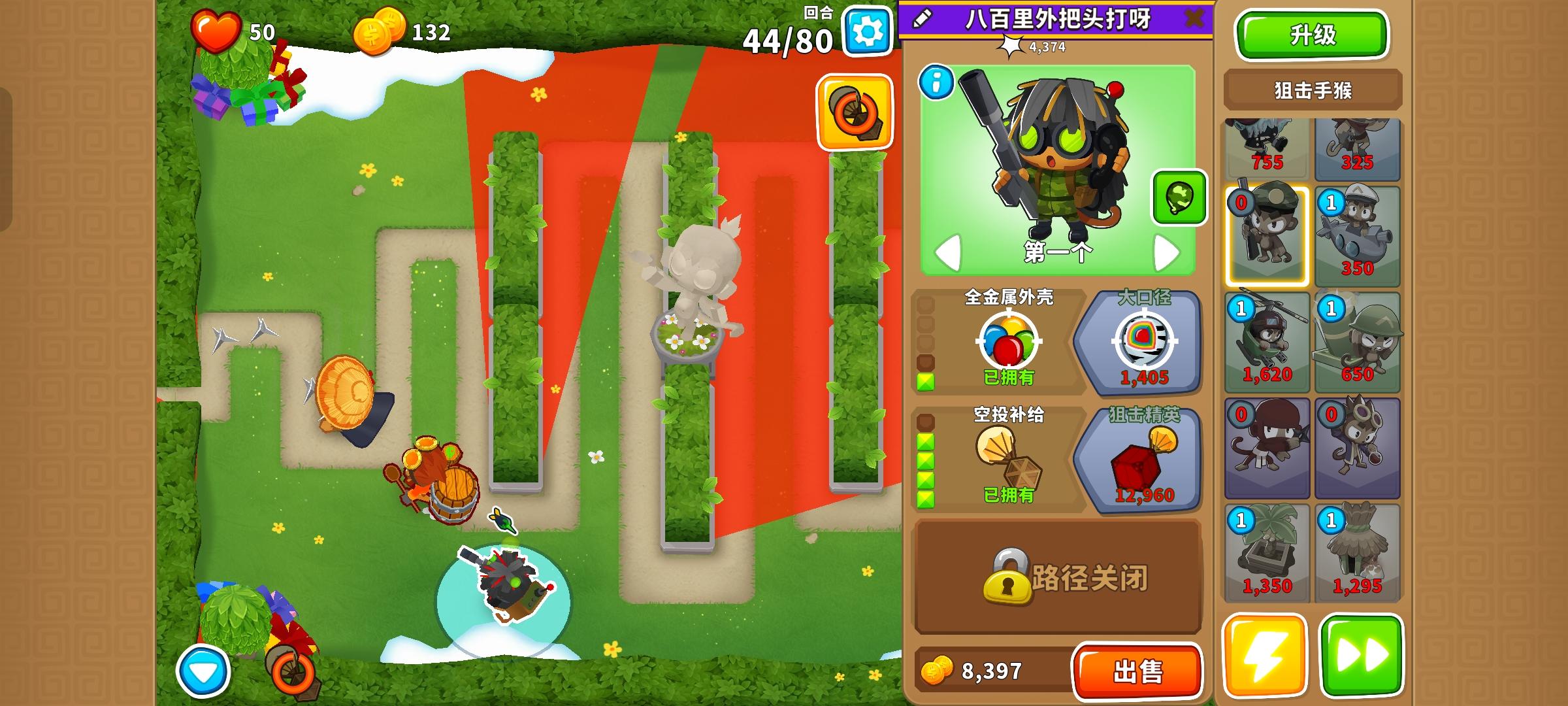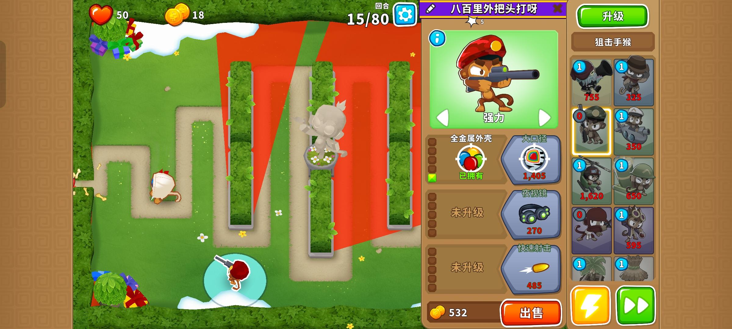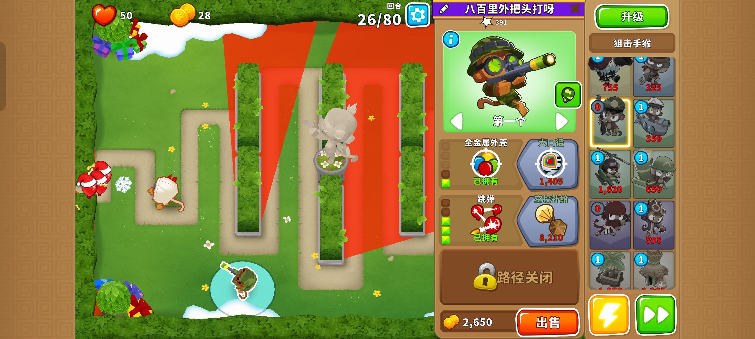 岛2:也是差不多的流程,只要放好位置就行,并且能将狙击手猴升到250。必要时也能用图上的机关补伤害!