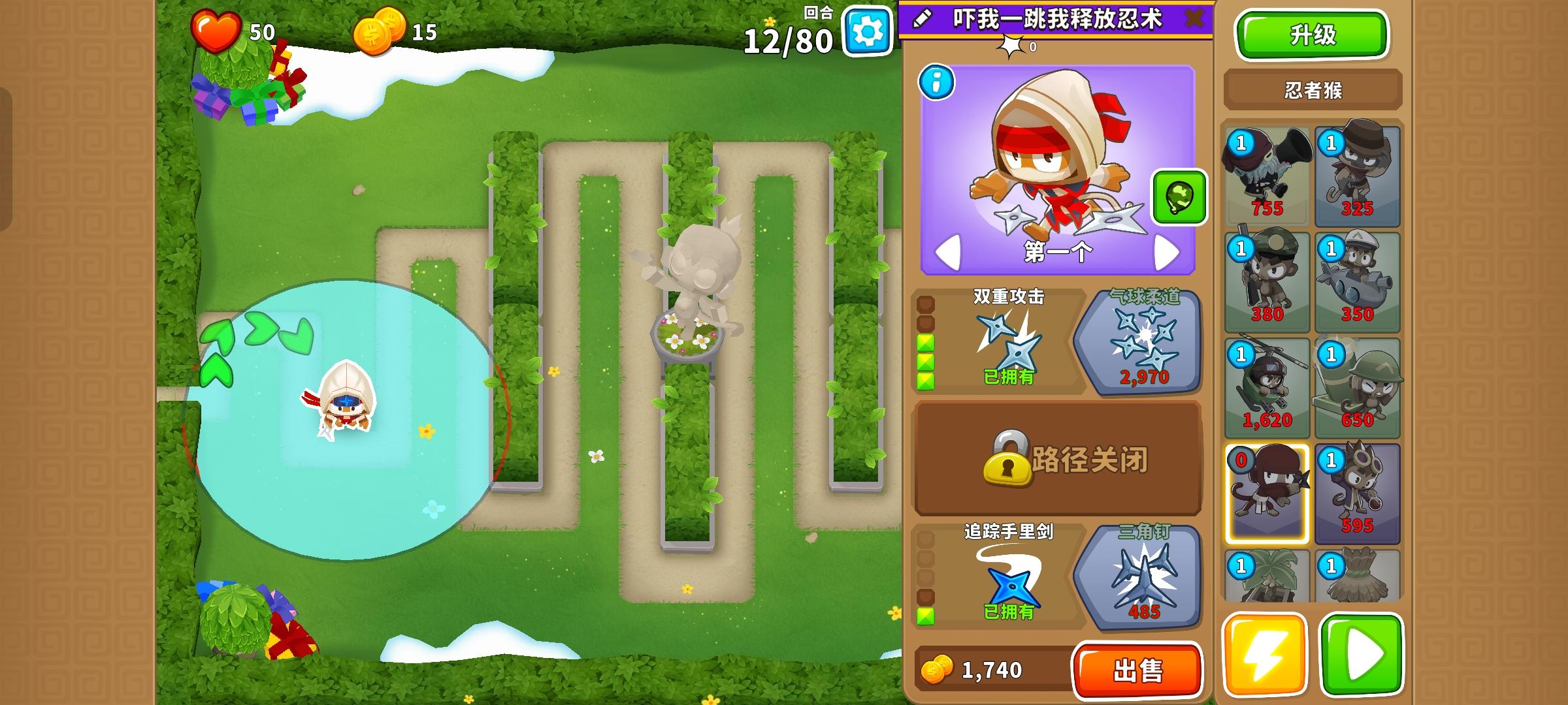 岛3:开局在第二个拐角处放下302忍者猴,然后可以优先在图上位置放下100狙击手猴,目标强力,逐渐升到130。忍者猴也能升到402,然后在他俩中间放下320炼金术师,狙击手猴也能升到140-250,有技能就用。钱够了就能升级忍者猴至502和炼金术师至520了!如果会漏气球就不升永久啤酒,用直升机飞行员来打伤害也是可以的!