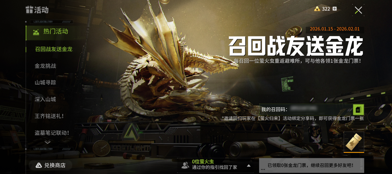 第一大保障——金龙门票获取易:针对所有回流玩家,通过“萤火归来”系统直接赠送金龙行动玩法门票;所有玩家都能通过“金龙挑战”活跃任务获取金龙门票;玩家通过“召回战友送金龙”活动召回玩家能快速获取额外的金龙门票,参与金龙行动挑战拿大金龙!