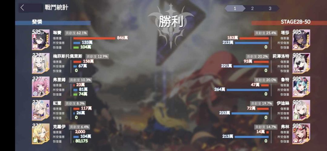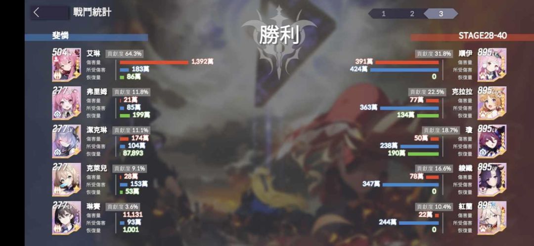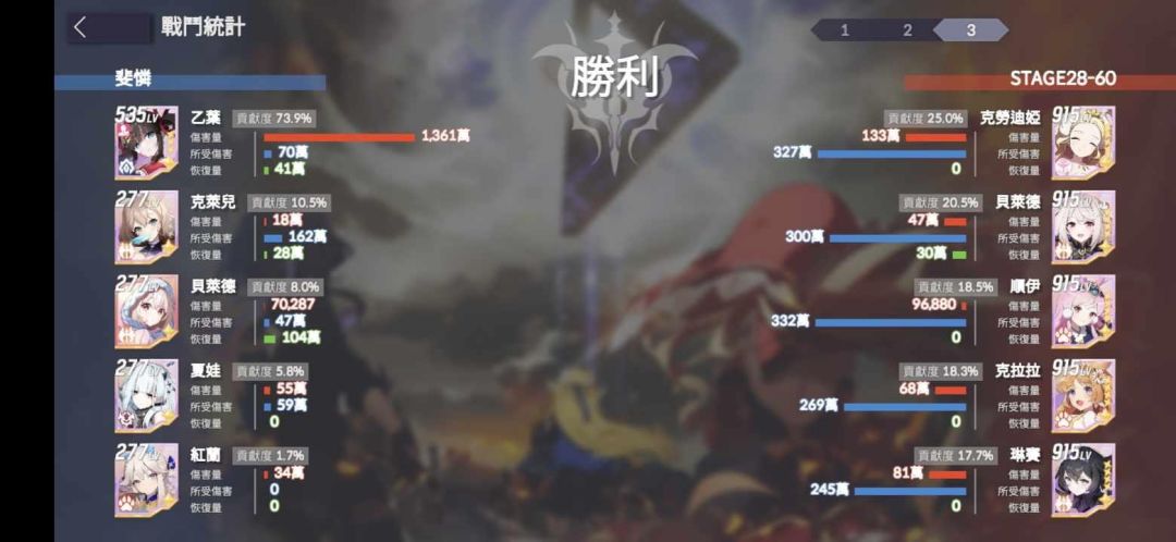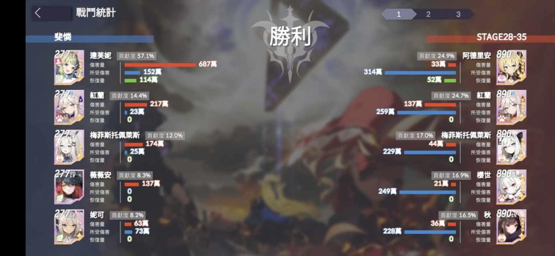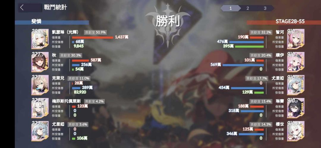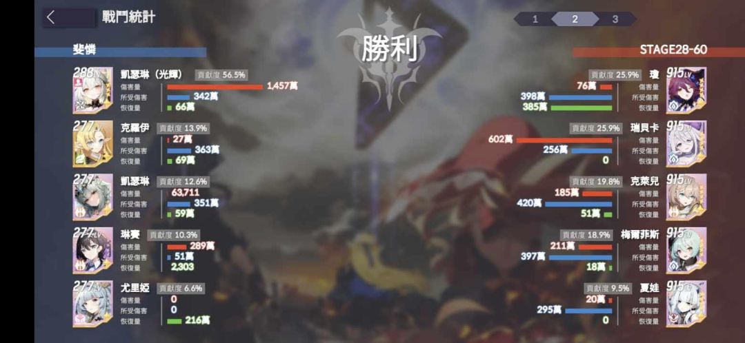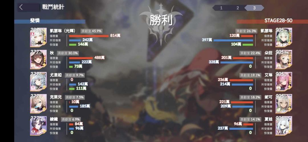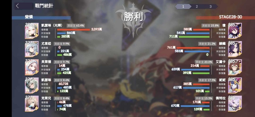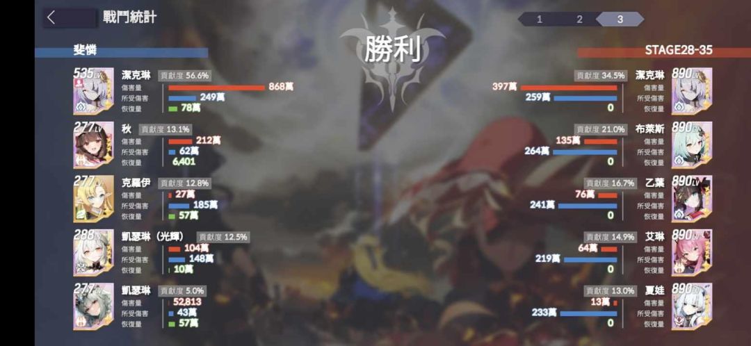 從這張圖可以看到,克羅伊和凱瑟琳聯手扛下了合計700萬的傷害,且是在對面有夏娃和梅爾菲斯等搞事仔的情況,所以如果運用得宜,即使只有傳說+也是能活下來的,這邊就要看站位的調整以及有沒有凹到迴避了。