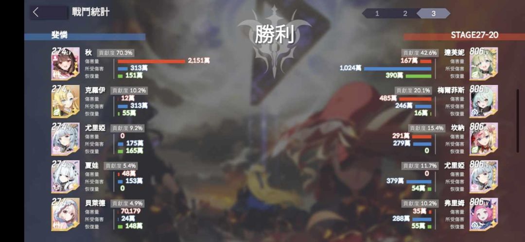 秋:我們的神,唯一裝備爆傷套,她有多強請見烏鴉佬的分析文,我就不多說明了。放一張圖來向大家展現秋的強度,扛最多的傷害,打最多的輸出,又回一大堆血。但是使用上需要擔心的是因為秋也是前排站位,還有使用主動技或大招都會移動到對方攻擊力最高的角色旁邊,所以如果開技能沒砍死對面,那麼秋是很容易被反殺的,所以請務必注意秋使用技能的當下是否達到了頂傷條件。