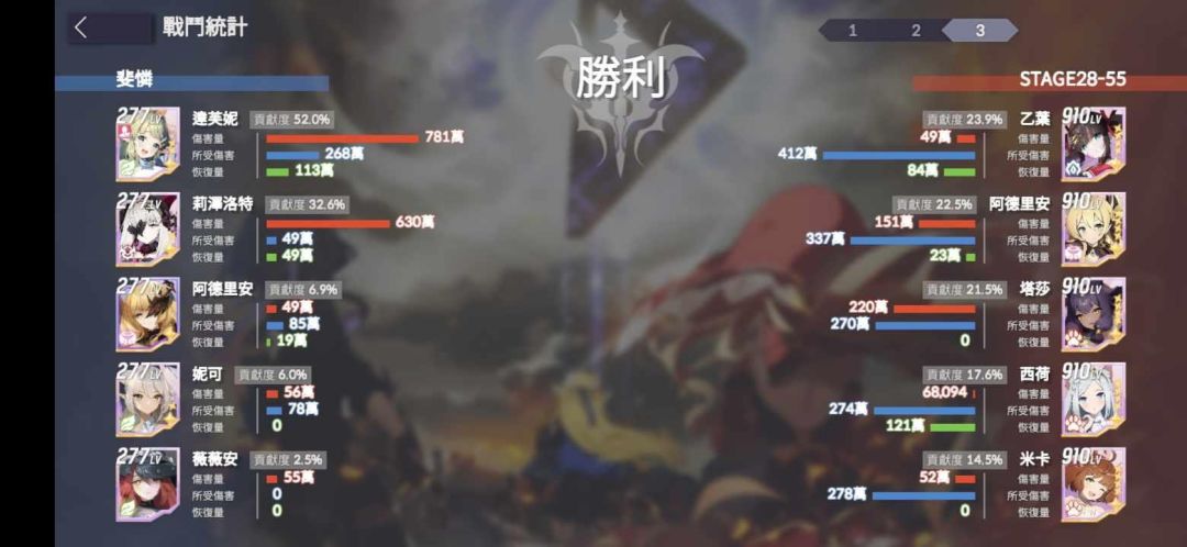雖然有點久了但我記得這關很機掰,印象中第一隊是帶克羅伊去嘲諷梅爾菲斯,給過勞凱跟一般凱當生存輔助,然後用秋+夏娃從阿勞開始斬,因為這隊沒有補師,所以秋一定能三連殺,看起來應該是只要活到秋能開技就贏了。第二隊借500等潔克琳+四個死人骨頭,跟28-55-2根本一模一樣,然後他們均等更低所以JK0應該能斬更快。最後一隊達芙妮+女王+紅蘭+魔女+莉澤,去搶達芙妮技能捶死前面兩個剩下的給莉澤收,這樣應該就過了。
