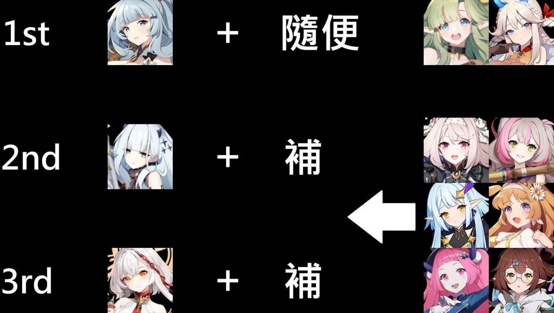 常規思路就是把夏娃、女王、過勞凱這三位萬用角色編入隊中,來使整體戰力得到一個平均,夏娃建議配秋,因為秋的輸出有時候會不夠;女王則可以配莉澤,因為莉澤本人就是輸出天花板,如果對面有一個隊伍是需要你使用夏娃+莉澤+過勞凱+女王才能打贏的話,那後面的隊伍能給的彈性就會少很多,整體過關難度也會因此上升,如果真的發生這種狀況,我建議明智的選擇是養生收菜過一兩個月後再回來打。當然上面這張圖是不借角的思路,如果要借角的話,可以考慮把強的角色塞成兩隊,剩下一隊放一些比較不常用的角色然後讓他們變成精靈石看大佬表演一打五。如果是把強角分成兩隊,然後以一隊借JK0為例的話,我會比較傾向這樣分配: