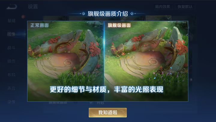 开启路径为:设置 → 图像 → 峡谷画质 → 极致画质下勾选“旗舰级画质。实际效果显示场景更明亮通透,草丛、地形等细节呈现更真实。