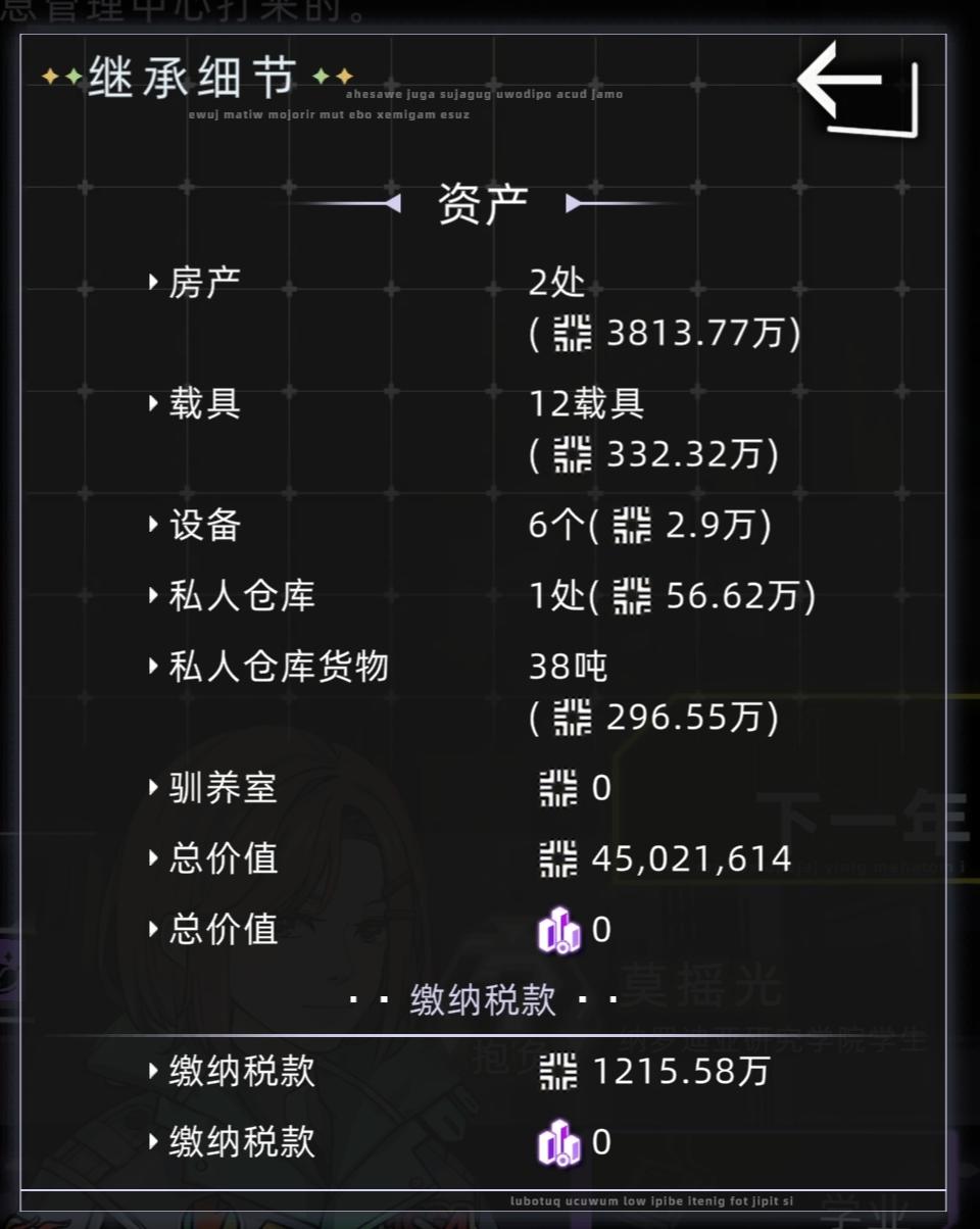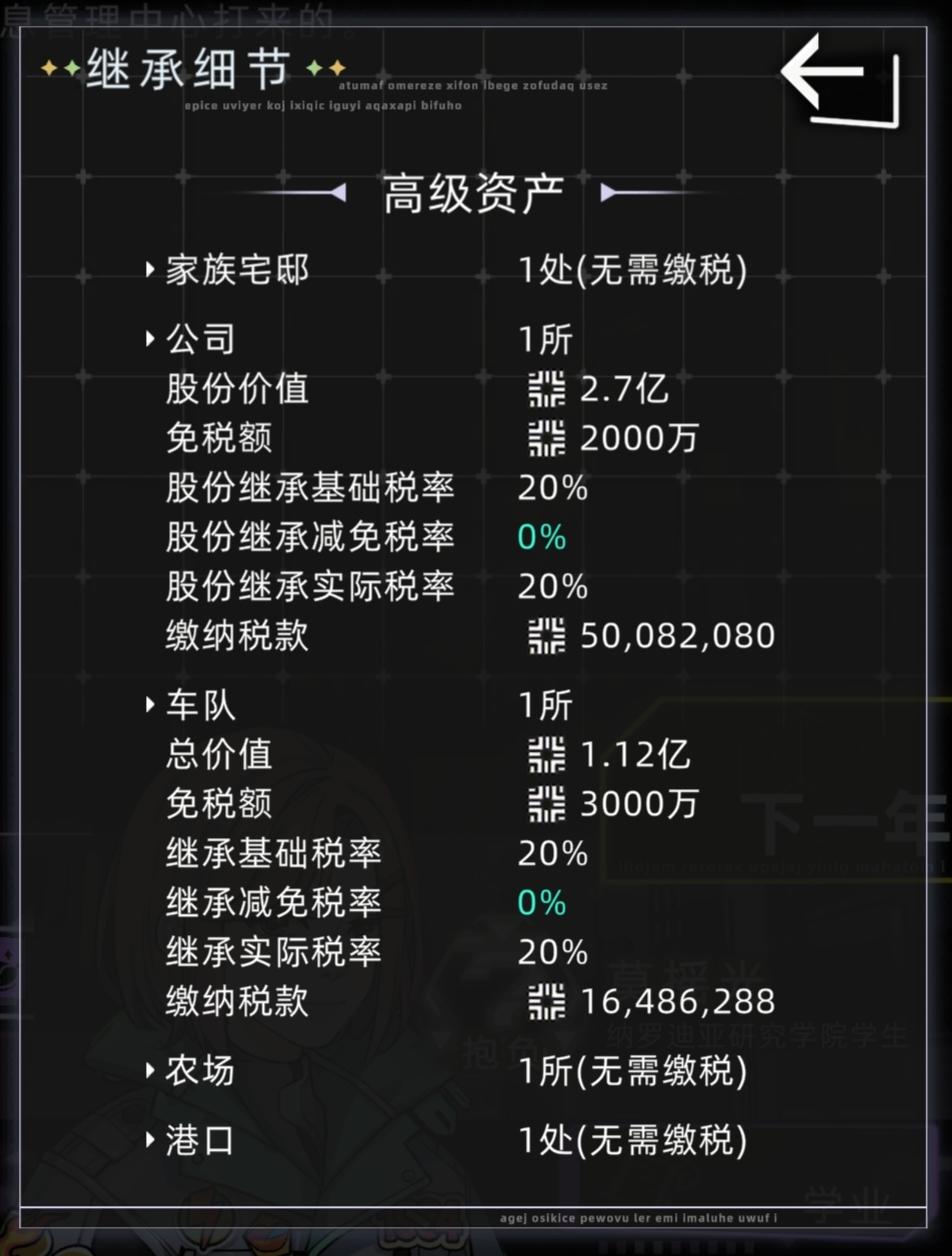 继承后:P4:“总价值”是P1折合加P6仓库驯养室;“继承后”是银行现金-税-资产税-高级资产税,最终继承的