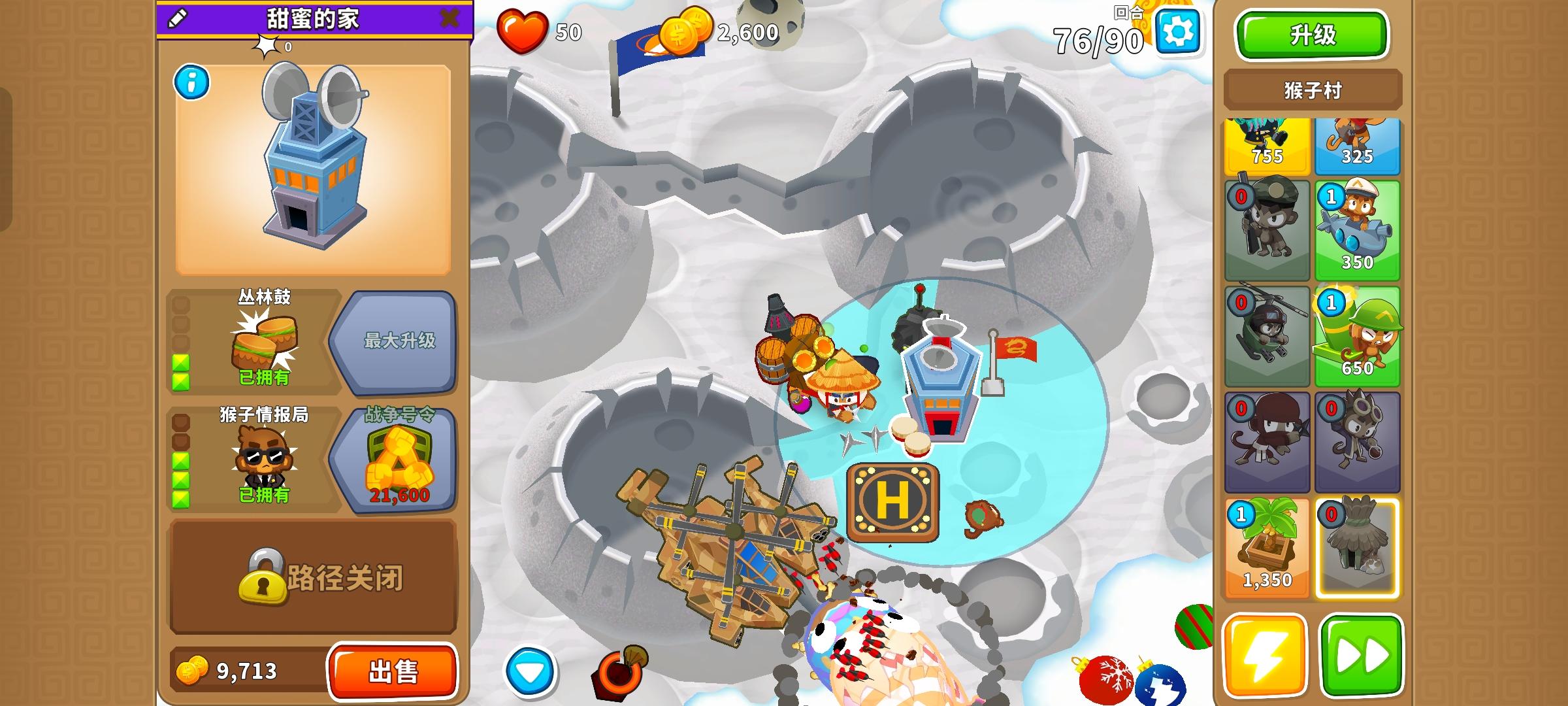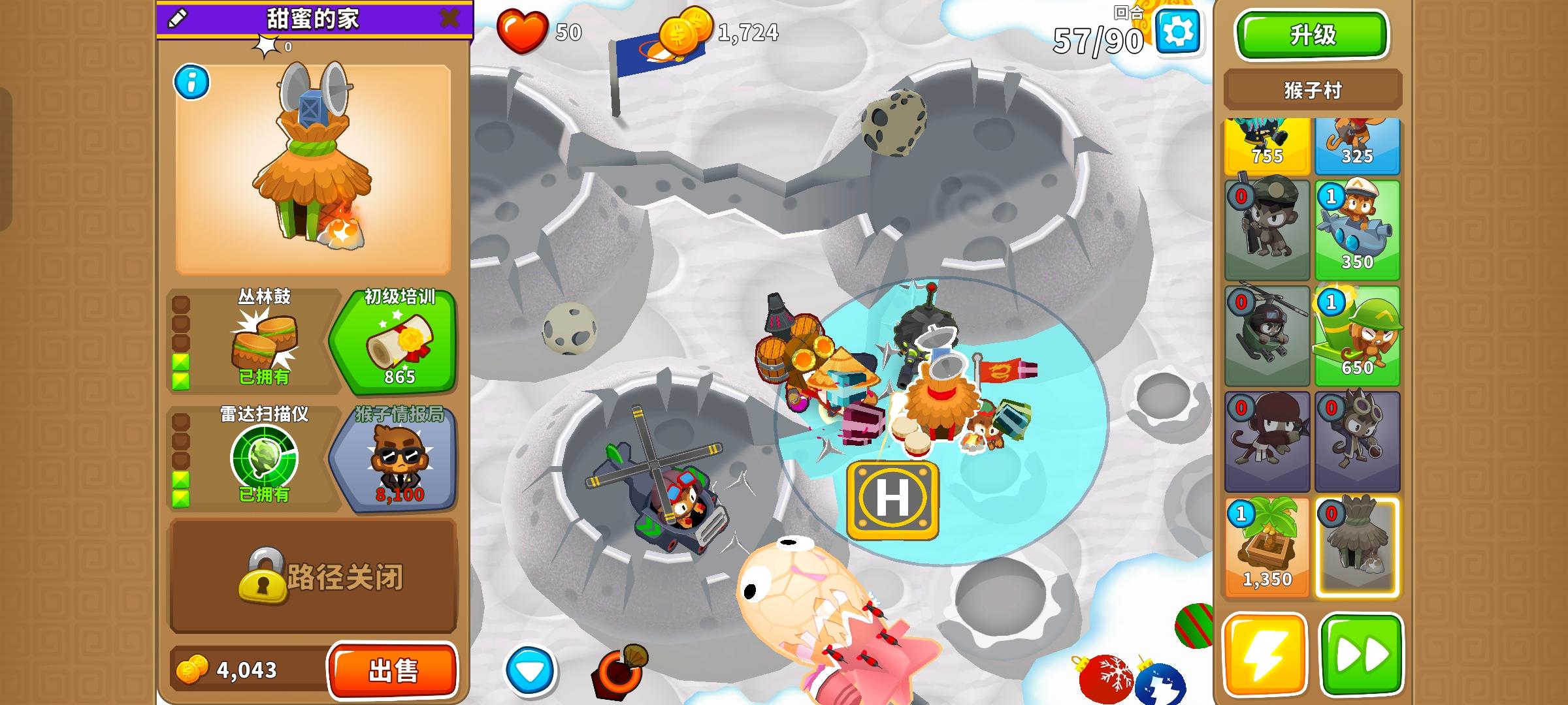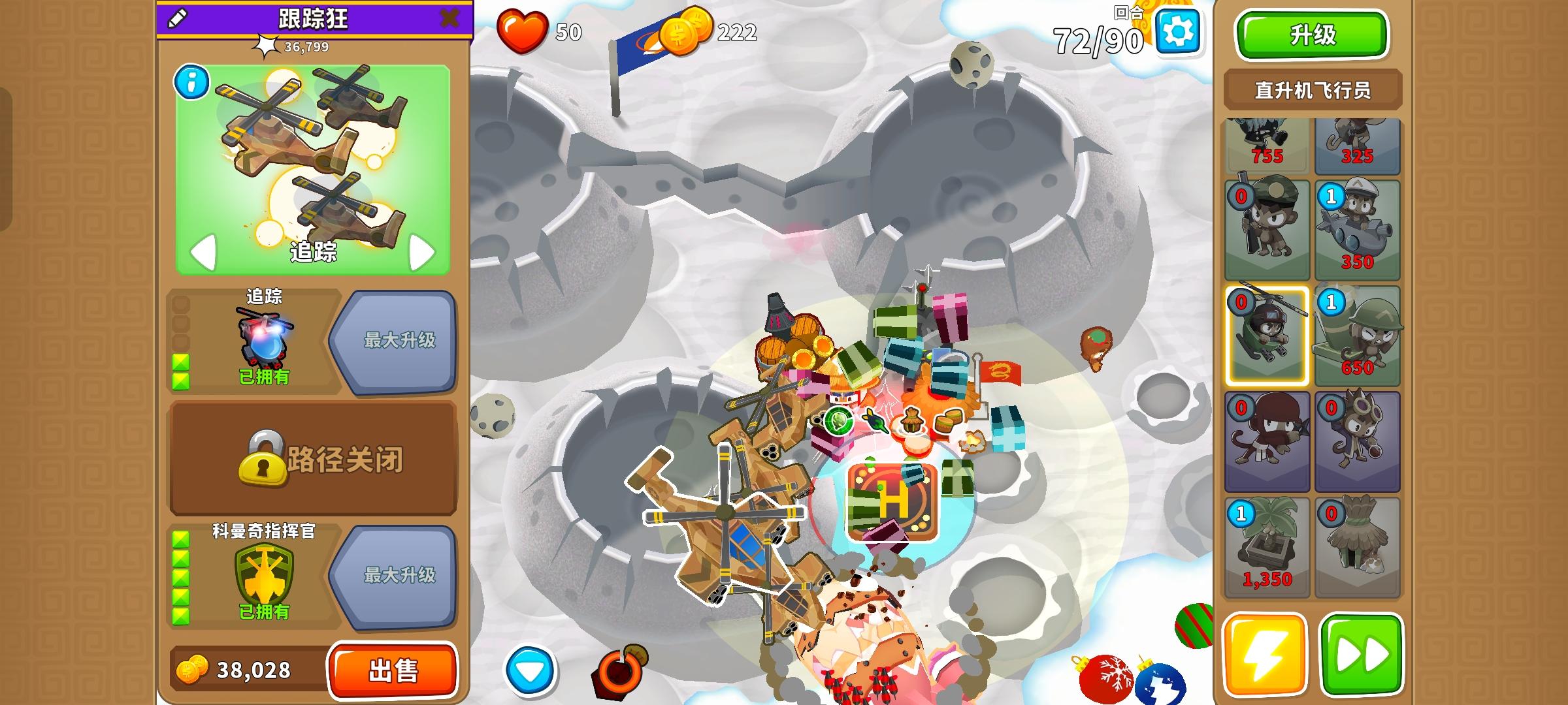 开局在图上这个位置放下302忍者猴,钱够了在这里放下120狙击手猴,优先升到130,并把忍者猴升到402。之后来个003直升机飞行员,控死飞艇做到通过第40回合。然后优先升级140狙击手猴,有技能就用,也要升级直升机飞行员的上路两级,并放下420炼金术师辅助。之后就能放心获得250狙击手猴了,目标第一个。接着先放个220猴子村覆盖所有猴子,就能放心把直升机飞行员升到205了。最后把猴子村升到230就行了!