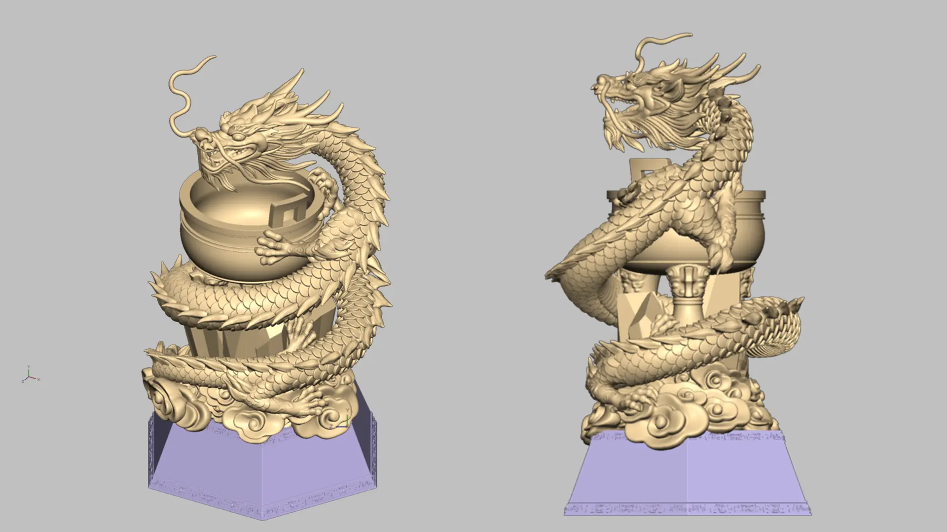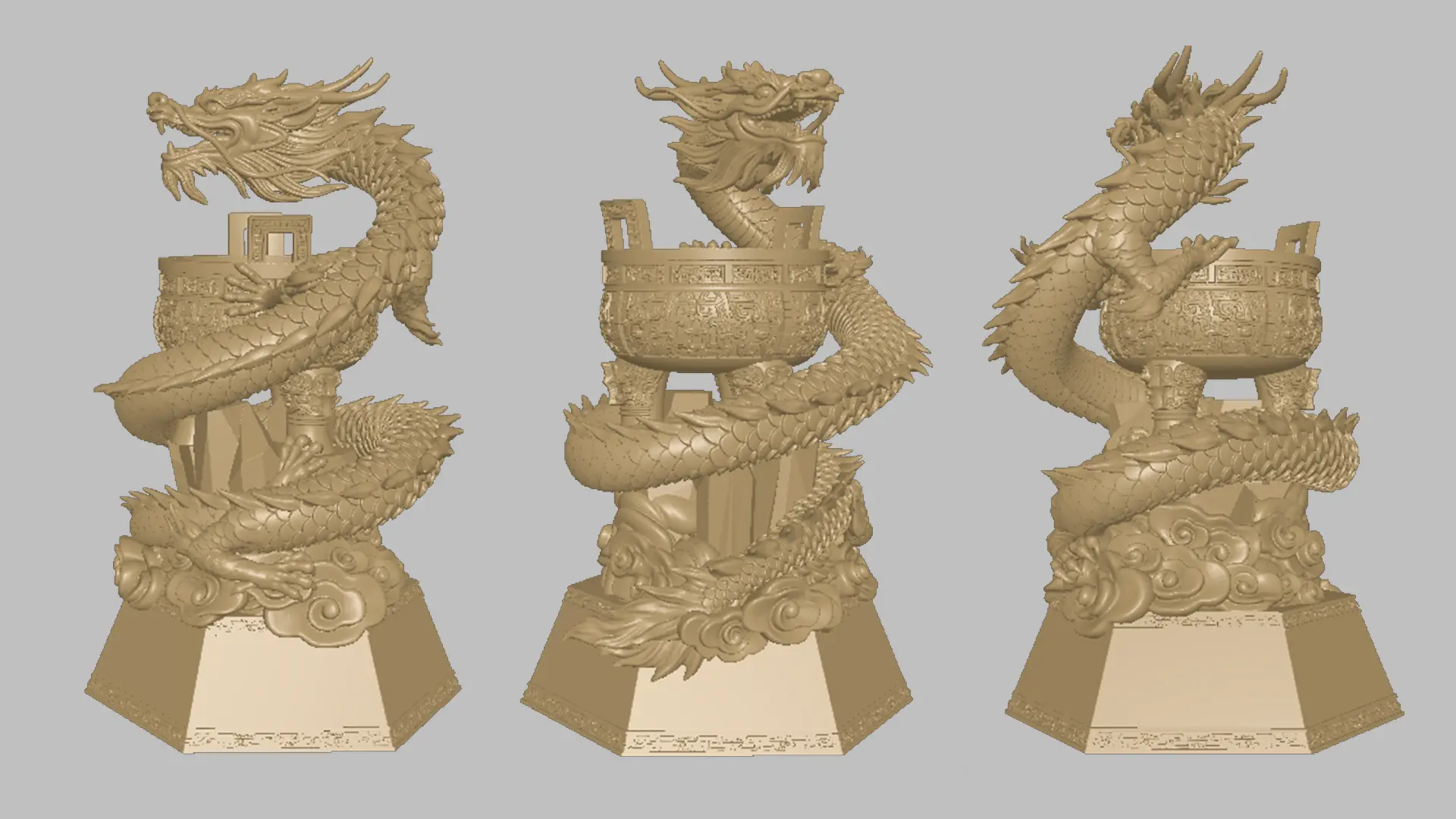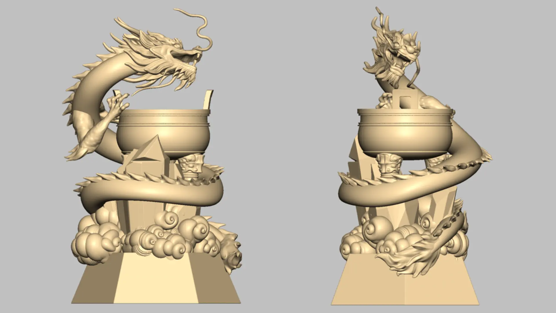 这座奖杯的设计并非一蹴而就,而是经历了多版严谨的演变,从初稿到修改再到最终定稿,每一次迭代都聚焦于细节优化,只为更好的代表与纪念S1问鼎的荣耀! 初稿搭建了“龙-鼎-云”的核心框架,这一版本虽未深入雕琢细节,但已精准锚定了“策定九州,龙鼎铸魂”的核心理念。