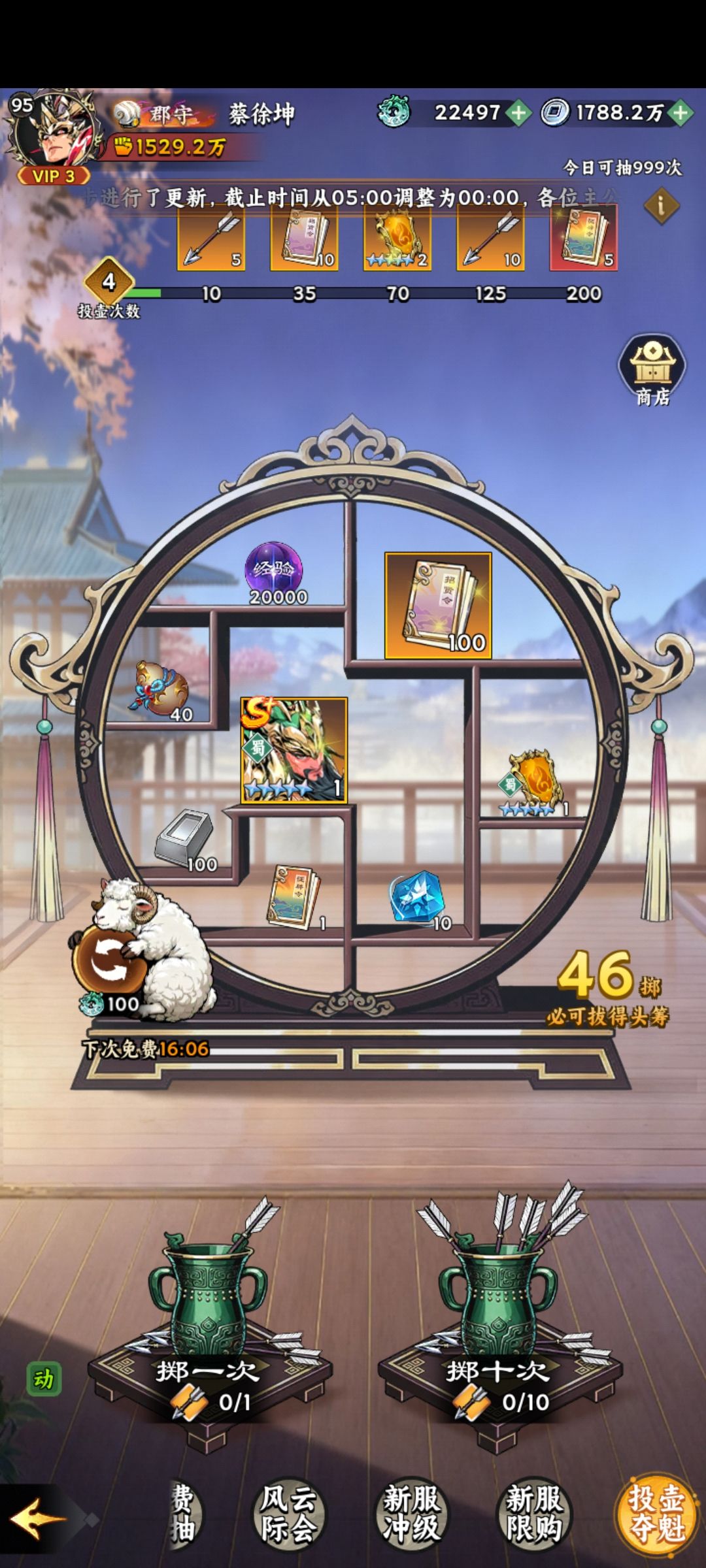 吕布就强在专武和额外出手。这个额外出手是可以正常加怒气和放大招,打不过的关都是多刷几遍,让他额外出手,额外出手时也能触发专武的攻击。前期想快速搞到专武,就把橙色武器分解了1把1千,攒够4万可以换。新区好像第5天开投壶夺魁,可以15000宝玉换一个核心,只追求本体时性价比高。目前打BOSS是同练度情况下吴国伤害最高。后期打boss时boss基础攻击力高,非常需要名士和美人补血。