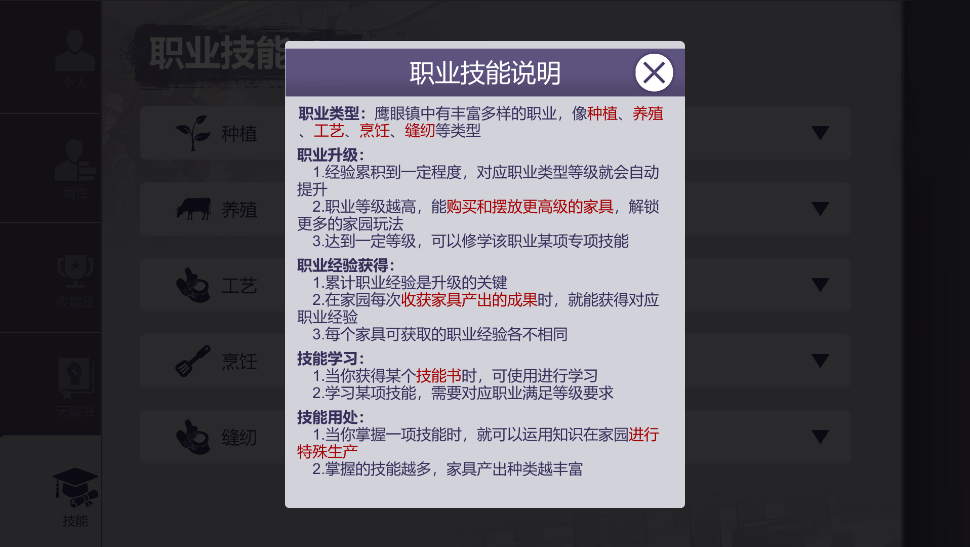 新增家园职业技能:种植、养殖、工艺、烹饪、缝纫;