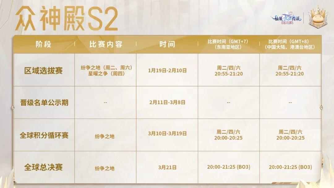 地区选拔赛阶段时间为1月19日05:00-2月11日 00:00。地区选拔赛采用的玩法为游戏内的【公会联赛】玩法。所有参与了公会联赛的玩家,将会自动报名参与众神殿的预选赛。