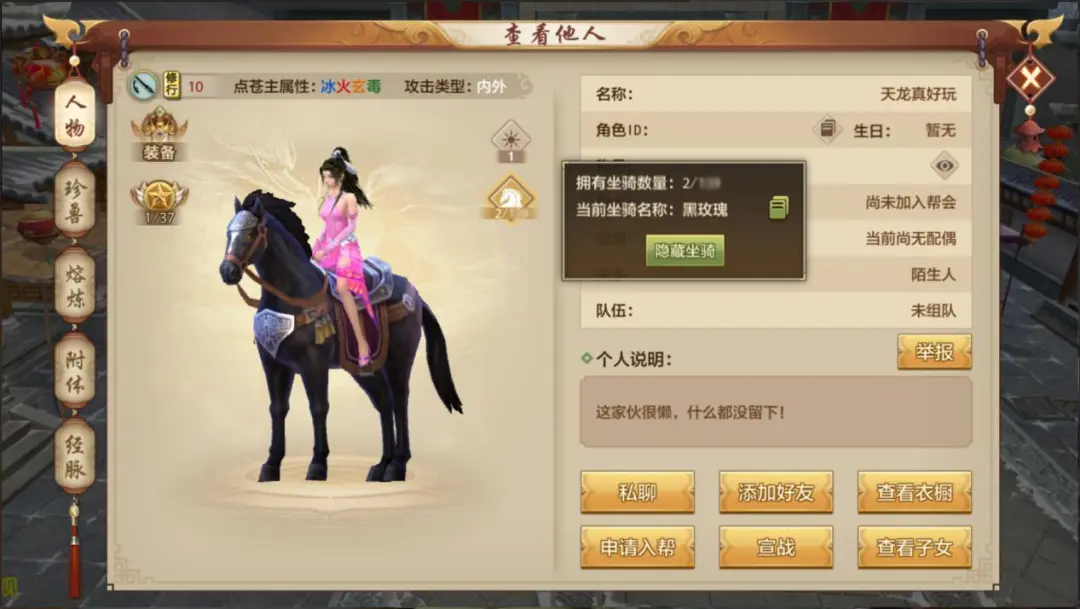 少侠:经典版个人界面能不能加个坐骑展示啊?我漂亮的坐骑,必须亮出来给全江湖炫耀一波!