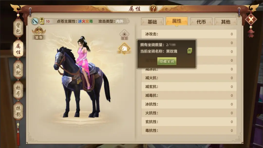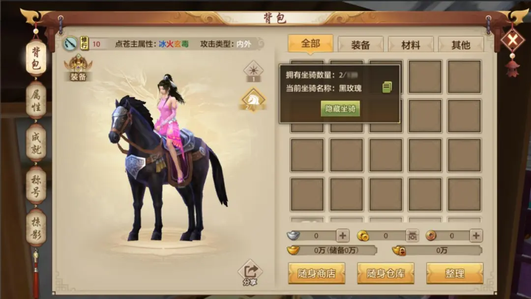 设置完成后,不管是在【背包】还是【属性】界面,都能直接预览展示的坐骑,其他少侠通过【查看角色】界面也能看到你的坐骑!