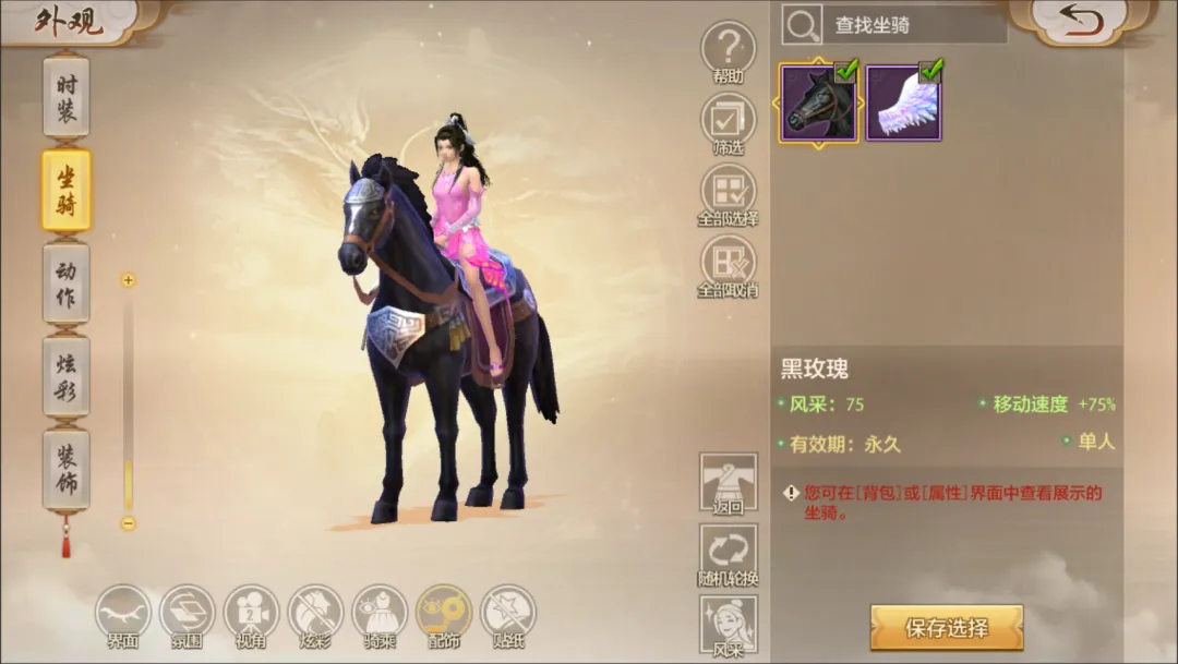 老赵小提示:坐骑展示设置页勾选的坐骑仅用于界面的展示,不会改变您实际出战的坐骑。