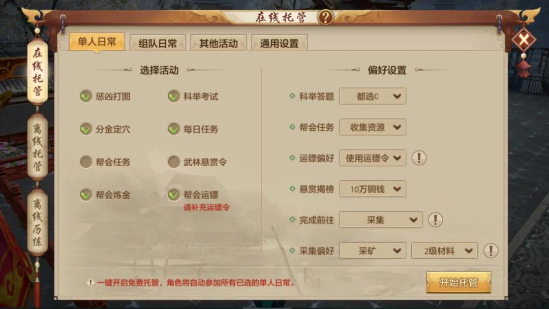 ●托管单人活动时直接选帮会运镖,还能设置自动用运镖令,省心又安全;