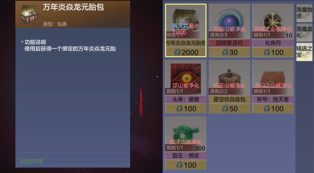 弥灾功累计达到7000后,即可花费2000荡魔令兑换【万年·冲炎·炎焱龙元胎】!