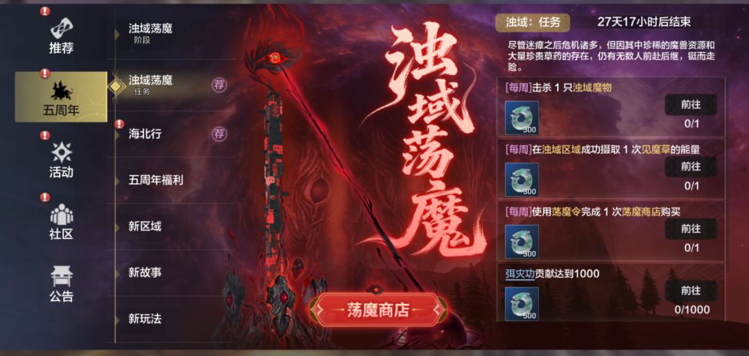 在【福利-五周年-浊域荡魔】中,完成简单的任务,即可获得大量的荡魔令,此处的荡魔令不会占用周获取数量的上限哦!