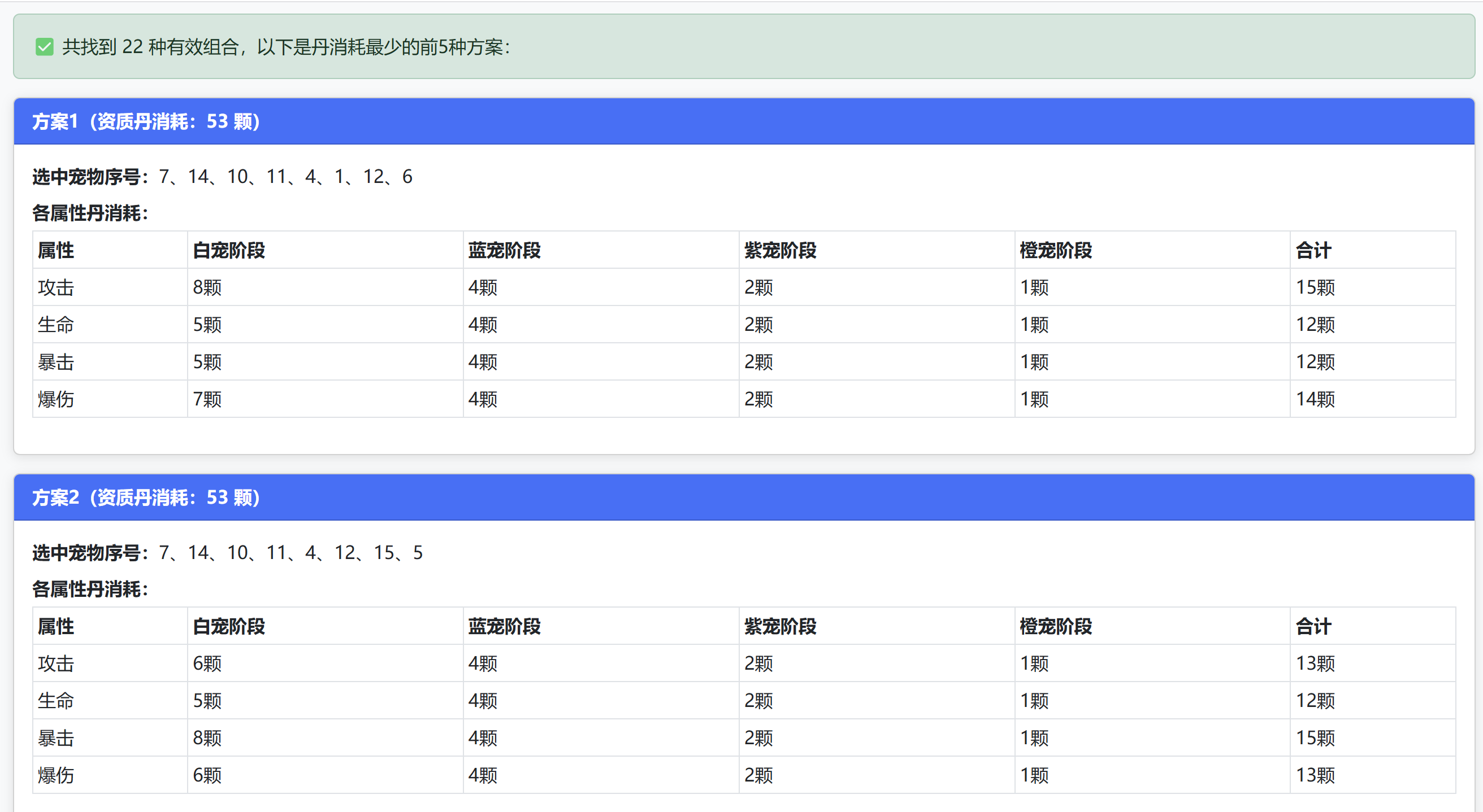 resultText.innerHTML = `<div class="alert alert-success">✅ 共找到 ${validPlans.length} 种有效组合,以下是丹消耗最少的前5种方案:</div>`;