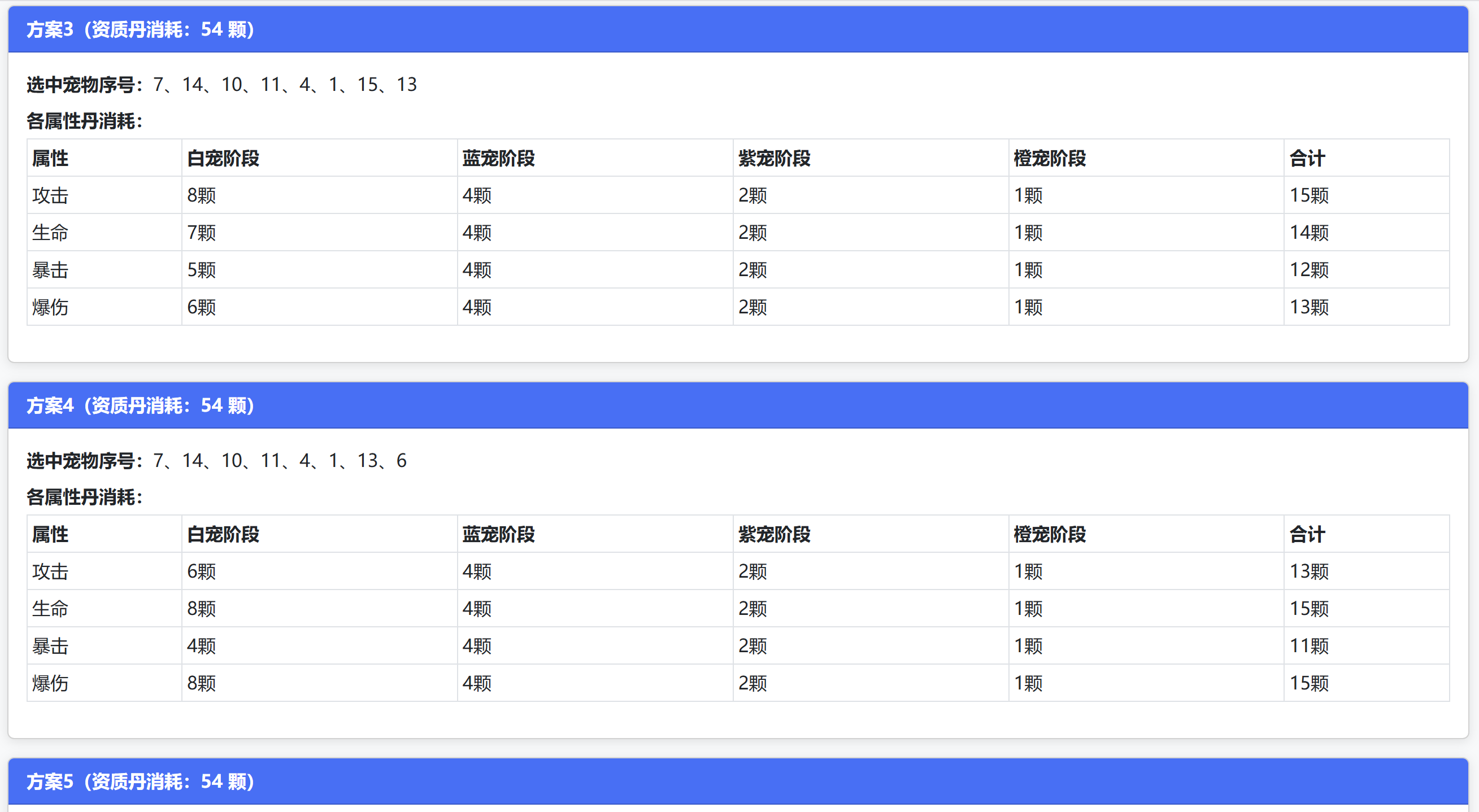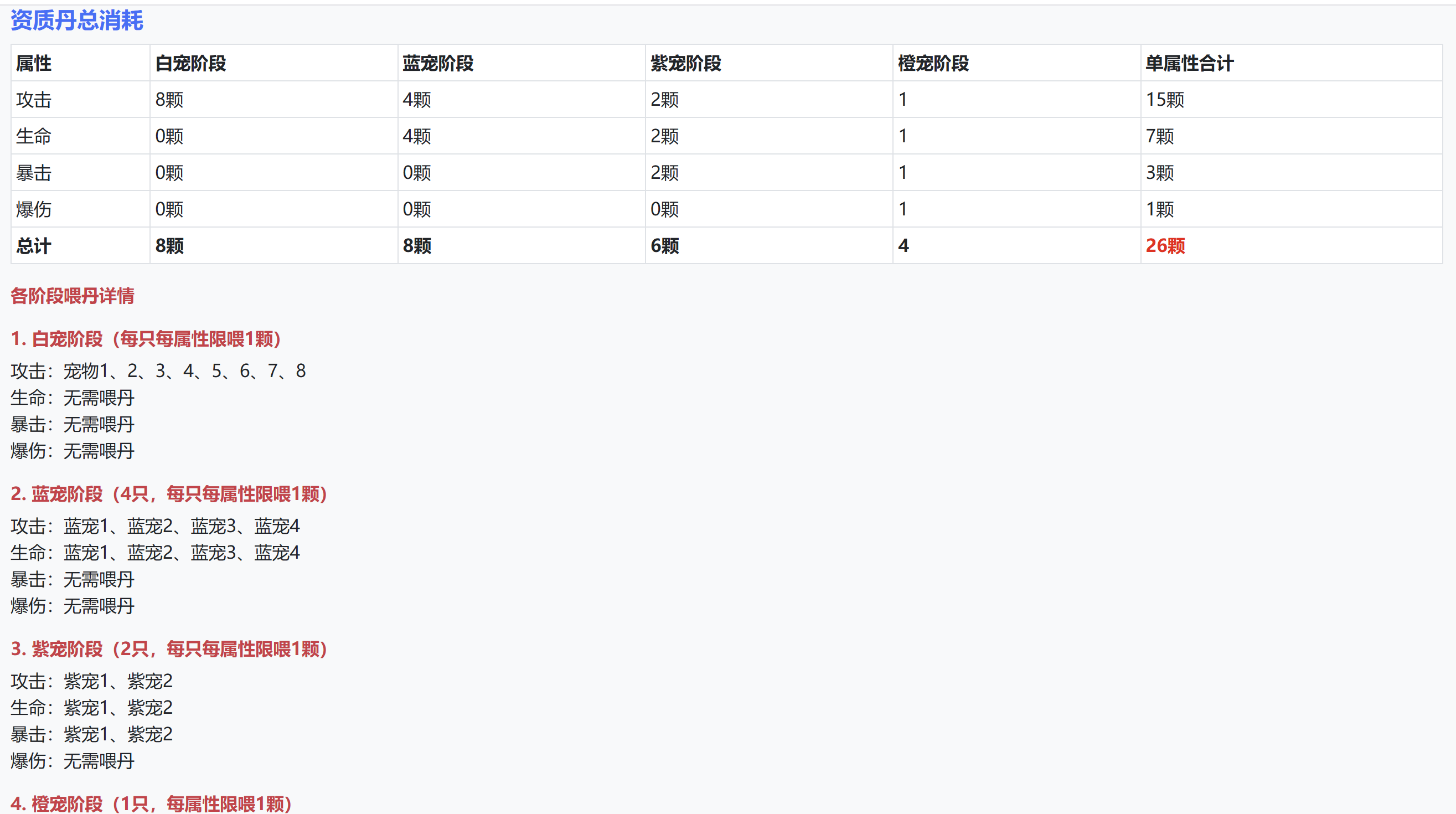 每一个阶段喂多少个资质丹,喂给谁,都给你计算的明明白白。