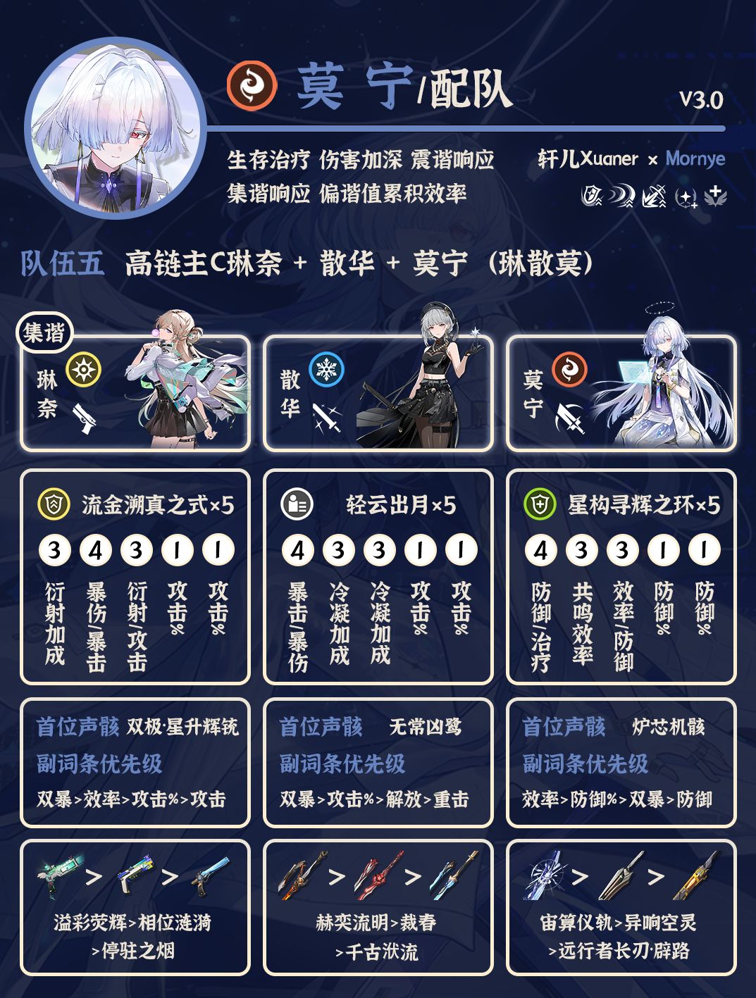 ⑤ 琳奈+散华+莫宁:琳奈做主C需要高链,最好是六链再玩。主C琳奈注意声骸需要改,共鸣模态选偏谐给自己和莫宁增伤。