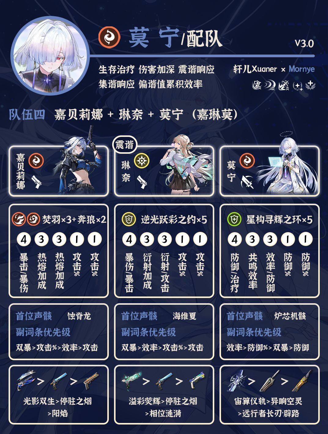 莫宁配队来啦~轩儿Xuaner给各位整理了鸣潮V3.0莫宁最新的配队推荐,包括队伍里每个角色声骸和武器推荐~