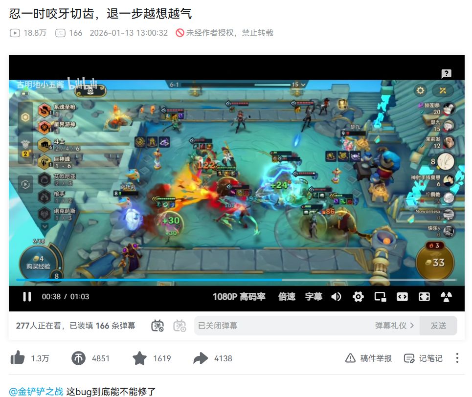 昨天一位叫作“古明地小五酱”的B站用户发了一段视频,里面是《金铲铲》的录屏,隔空喊话《金铲铲之战》让官方修BUG。