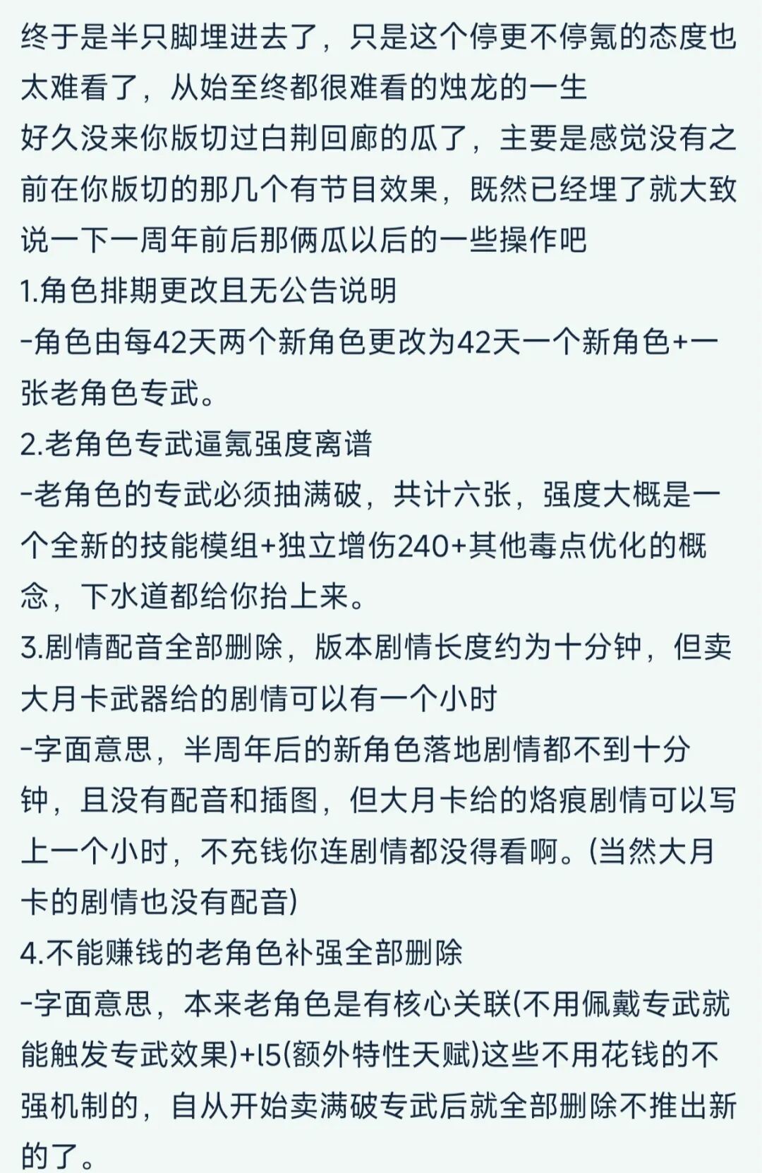也难怪玩家会如此怨念,甚至在停更之际也忍不住要说一句好似。游戏本身也许还是好的,姬看到的绝大多数讨论都聚焦在运营和数值上,对剧情和美术的批判算是少数了。