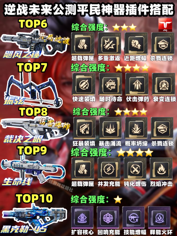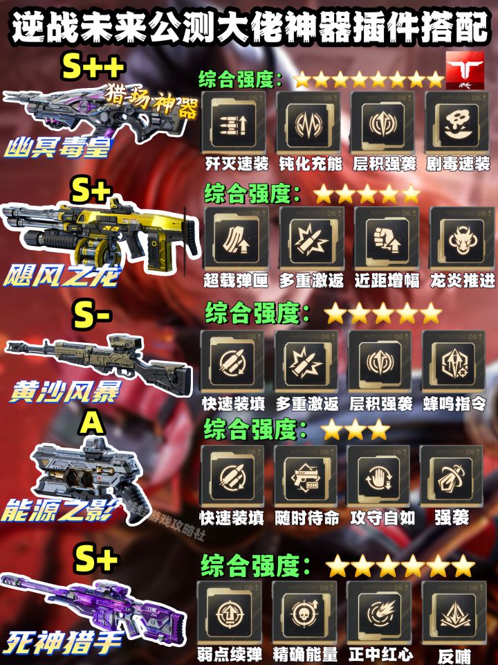 给大家整理了逆战未来公测的神器插件搭配,分平民款和大佬款两类。平民神器里死亡猎手稳居TOP1,插件选弱点弹缚、多重激返等组合,黎明之光、雷霆999也有对应的最优插件搭配,沙王之怒清怪快,插件选战术装填这套也很合适。大佬专属的幽冥毒皇、死神猎手等武器,插件侧重歼灭速装、钝化充能这类,能把武器强度拉满,新手照着配装就能上手。