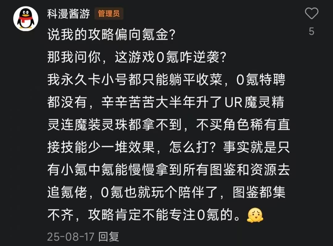 某位故人在访谈中提到自己是零氪攻略师然后拿自己和科酱做对比,科酱如是回复