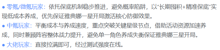 写的不是人话,但我这么给大伙解读吧:“依托保底机制稳步推进,避免概率陷阱”意思就是零氪等雅典娜进流星节再抽,首发别抽因为首发零氪不够保底;“长期囤积+精确保底”就是给流星节屯钻,屯好了之后等雅典娜进流星节就抽;低成本是人家相较于氪金抽而言的,毕竟人家眼里不氪就是没成本,钻石在重氪眼里那形同虚设;至于这个保证雅典娜一星是对微氪玩家说的,毕竟人家有了斜杠,看看就行了。