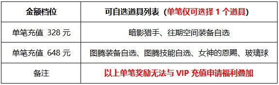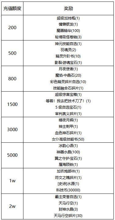 活动规则:活动期间,玩家单笔充值指定金额,即可联系客服申请自选奖励1个;